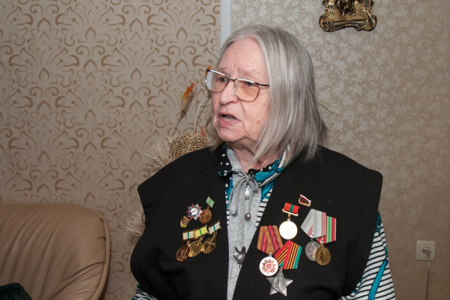 «За счёт папы выжили, того, что был военным, не курил, давал нам часть своего пайка, а сигареты выменивал на продукты. Ещё спасало, что печка была, буржуйка, которую топили паркетом с пола, мебелью. Потом была эвакуация, но в ней столько людей гибло - немцы постоянно бомбили. Эта картина на всю жизнь остаётся, как летит самолёт — они же низко летали — и бомбит, первый вагон разбили, а наш остался, мама нас подушками накрывала…», — рассказывает она.
