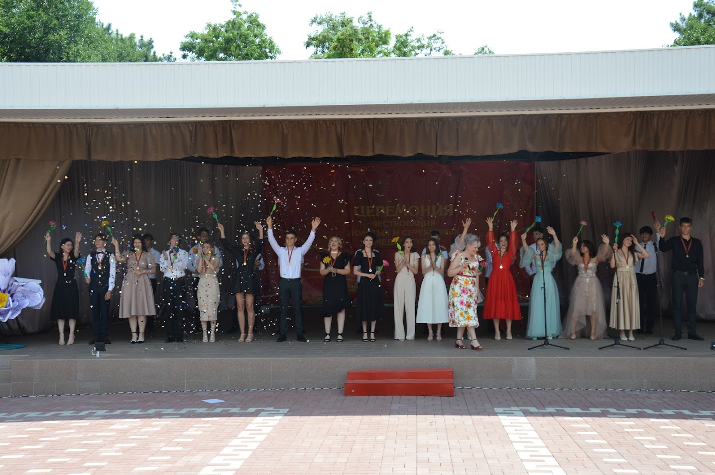 В заключение церемонии каждый выпускник добавлял по лепестку в круглую импровизированную подставку на ножке, произнося слова благодарности учителям. В результате получился великолепный цветок, символизирующий признательность и уважение к своим педагогам.