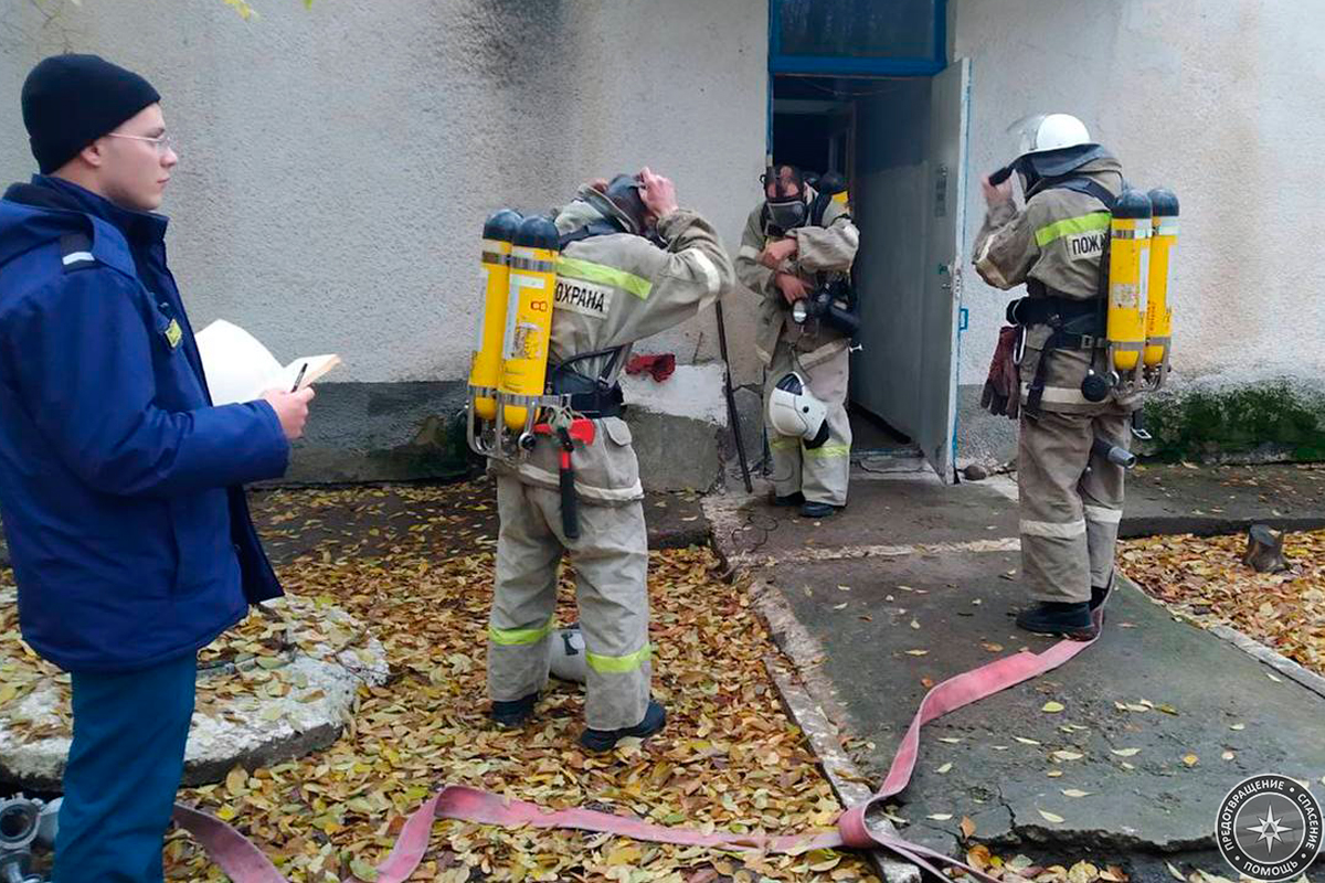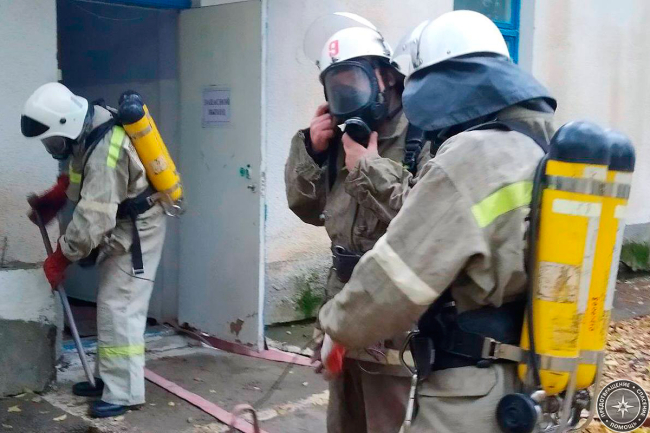 Пожарные в газодымозащитной экипировке проводили разведку и одновременно тушили условный пожар. Работника пищеблока нашли на кухне, из-за сильного «задымления» он не смог самостоятельно покинуть помещение. «Пострадавшего» эвакуировали и передали сотрудникам скорой помощи. Локализовать «пламя» пожарным удалось за 5 минут.