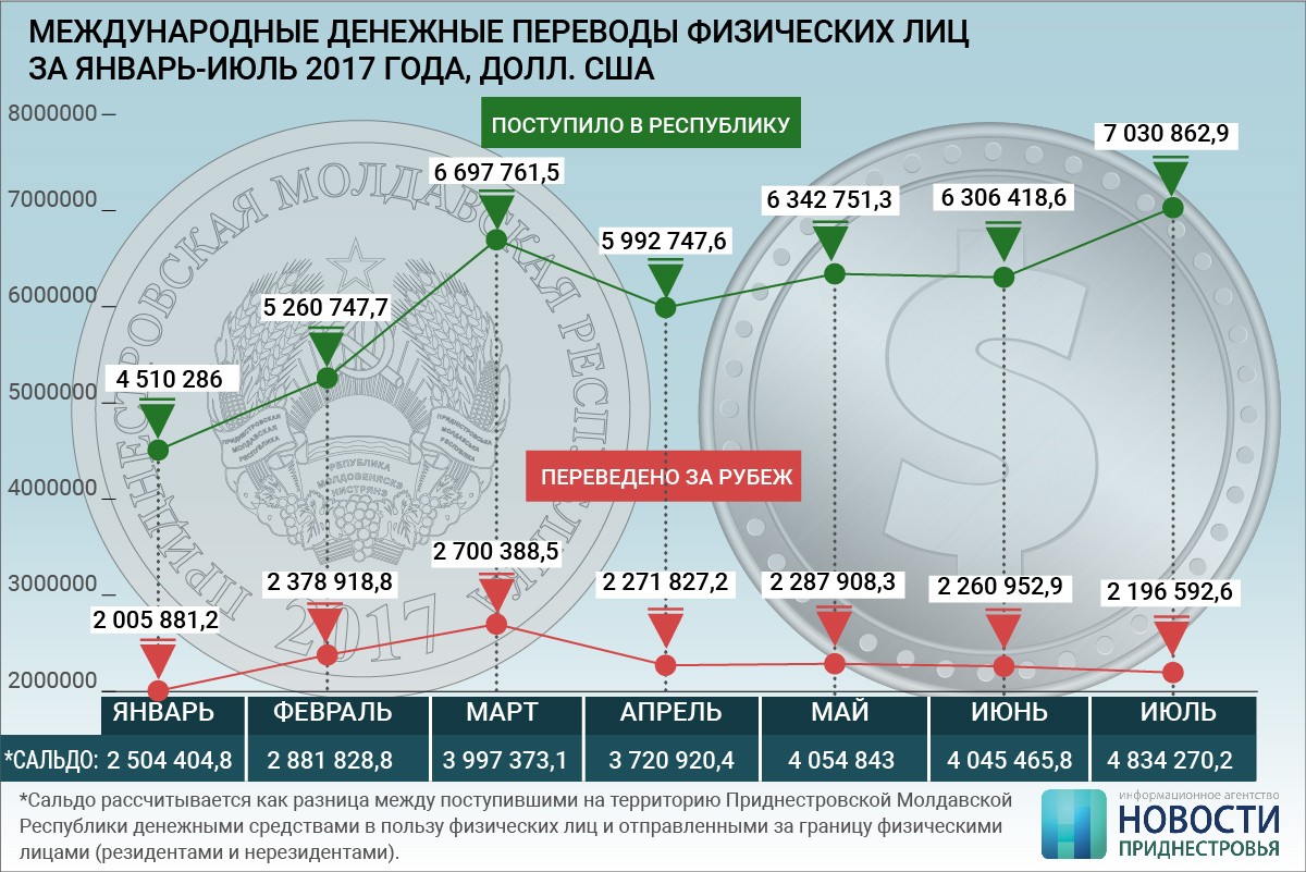 Тирасполь, 28 августа. /Новости Приднестровья/. В июле денежные переводы граждан из-за рубежа выросли по сравнению с предыдущим месяцем, составив более 7 млн долларов (в июне — 6,3 млн долларов). При этом граждане меньше отправляли денег в другие страны посредством электронных систем - $2,2 млн против $2,3 млн в июне. Сальдо составило $4,8 млн.