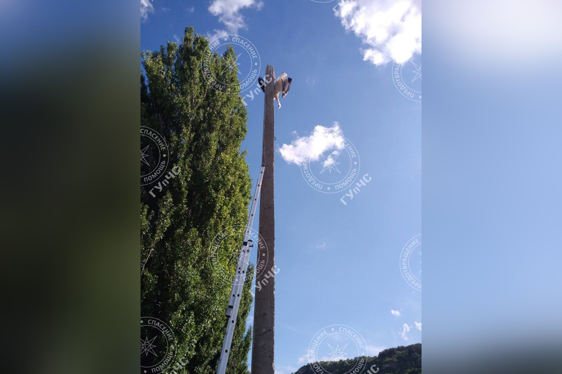 Каменский район, 10 августа. /Новости Приднестровья/. Вечером 9 августа очевицы сообщили дежурному по каменскому аварийно-спасательному подразделению об аисте, который запутался в проволоке на железобетонном столбе.