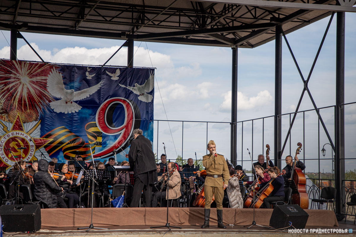 Открыл программу Государственный симфонический оркестр. Помимо классических композиций, музыканты вместе с вокалистами исполнили известные военные песни «Если б не было войны», «А зори здесь тихие», «Журавли», «Тёмная ночь» и другие. Перед бендерчанами выступил и Приднестровский государственный хор.