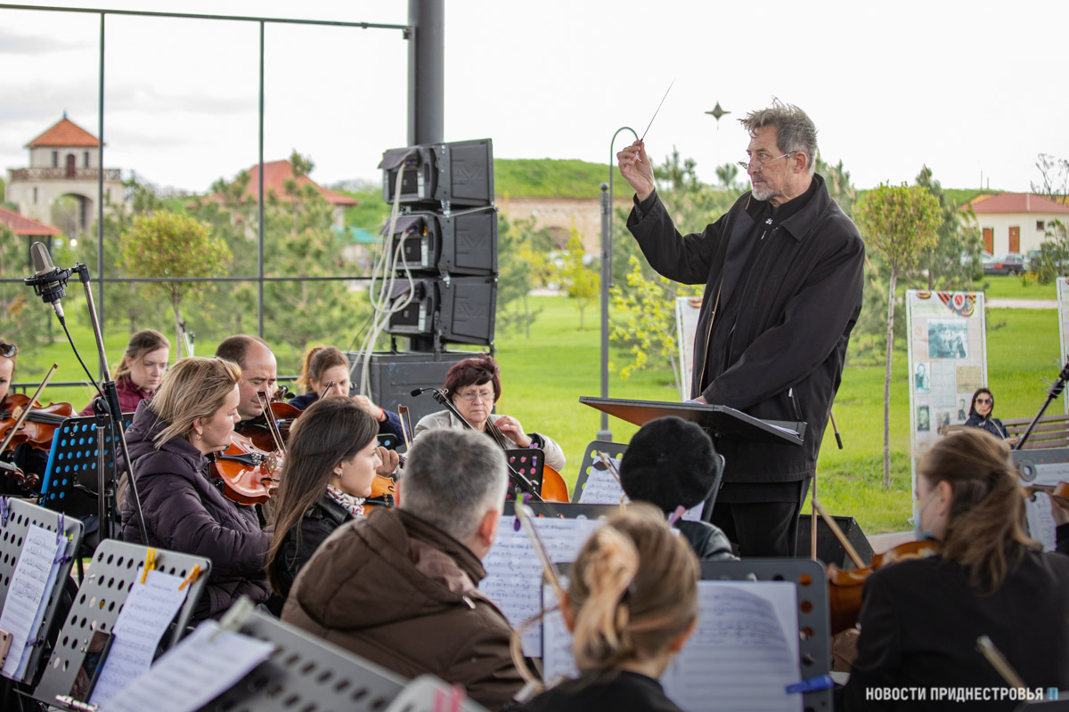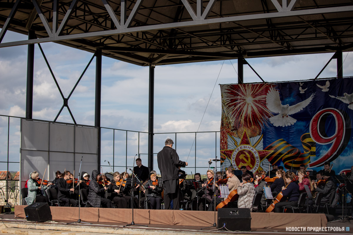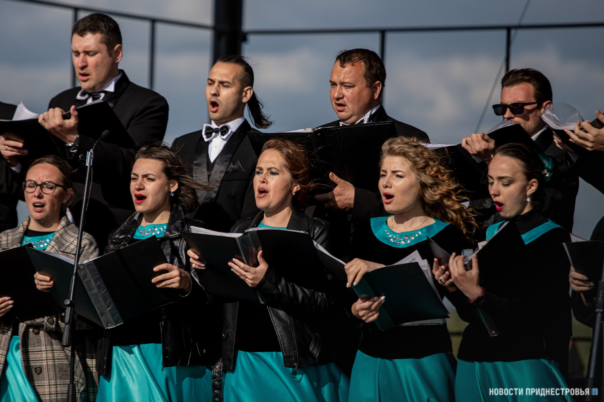 Артисты оркестра Тираспольского юридического института порадовали зрителей патриотическими песнями «Нам нужна одна победа», «День Победы» и многими другими.