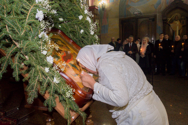 Праздничная служба традиционно длилась три часа и состояла из трёх частей: «Великого Повечерия», «Утрени» и «Первого Часа».