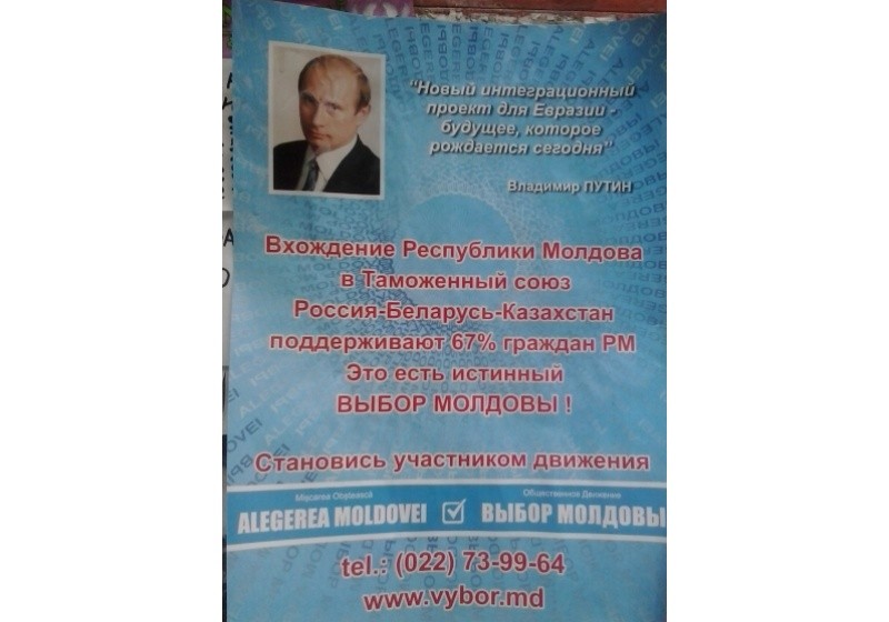 17 Apr., 2013, 16:06Листовки с изображением президента Российской Федерации Владимира Путина, а также с призывом поддержать присоединение Молдовы к Таможенному союзу, куда на данный момент входят Россия, Белоруссия и Казахстан, появились на подъездах домов жителей Кишинёва.