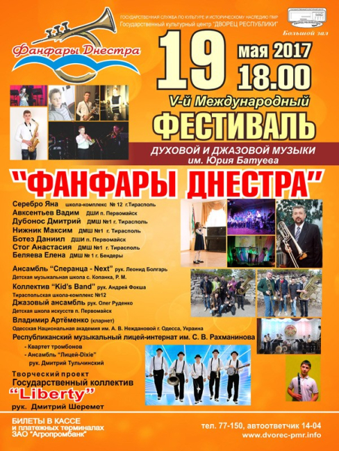 Тирасполь, 17 мая /Новости Приднестровья/. V Международный фестиваль джазовой музыки «Фанфары Днестра» пройдет 19 мая в большом зале Дворца Республики в Тирасполе. В нем выступят музыканты из разных уголков Приднестровья, а также гости из Одесской Национальной академии им. А. Неждановой и Республики Молдова.