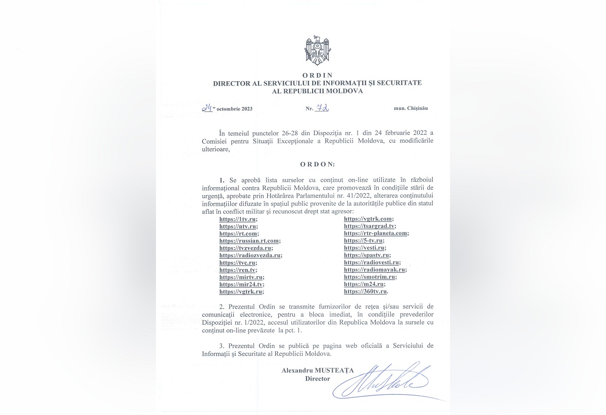 Директор Службы информации и безопасности Молдовы Александру Мустяцэ подписал приказ, в соответствии с которым в РМ должны быть заблокированы 22 сайта российских телеканалов и радиостанций.