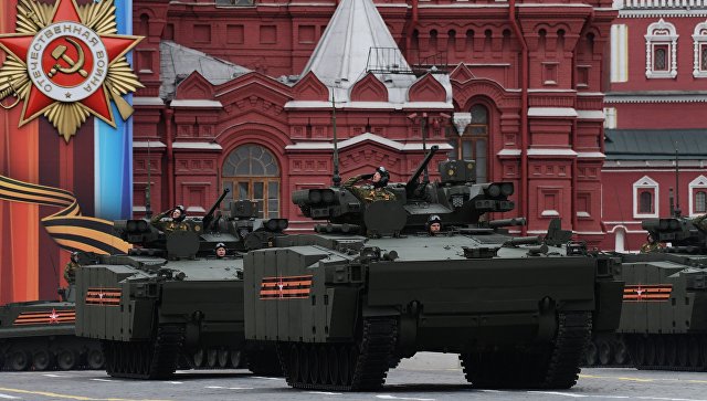 Замкнут колонну военной техники перспективные боевые машины пехоты на платформе «Бумеранг», которые проследуют за подвижными грунтовыми ракетными комплексами «Ярс».