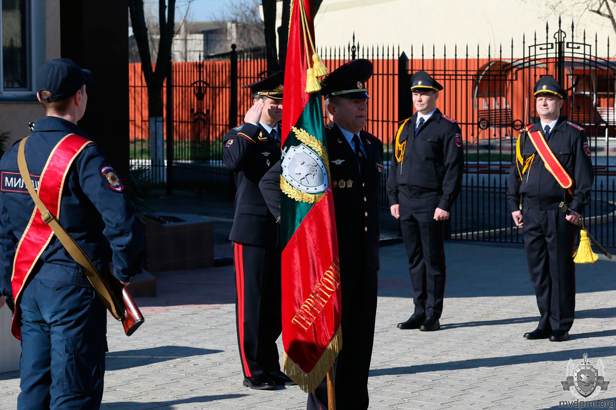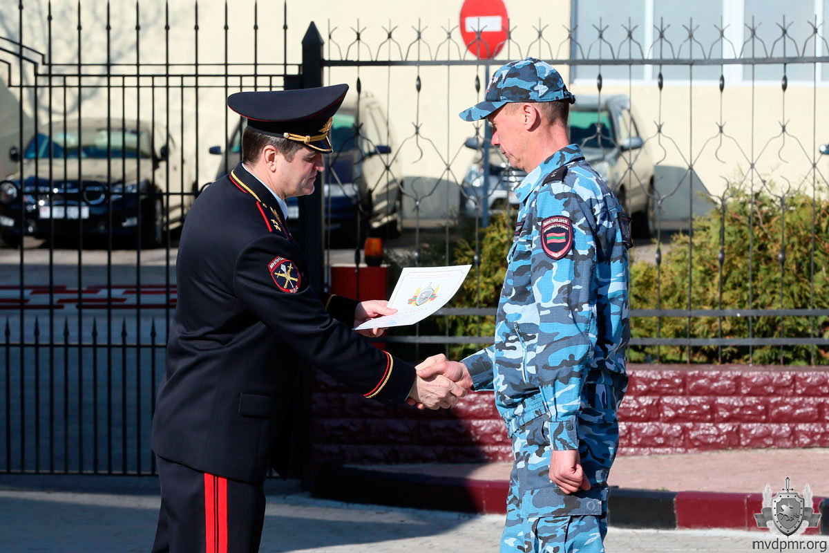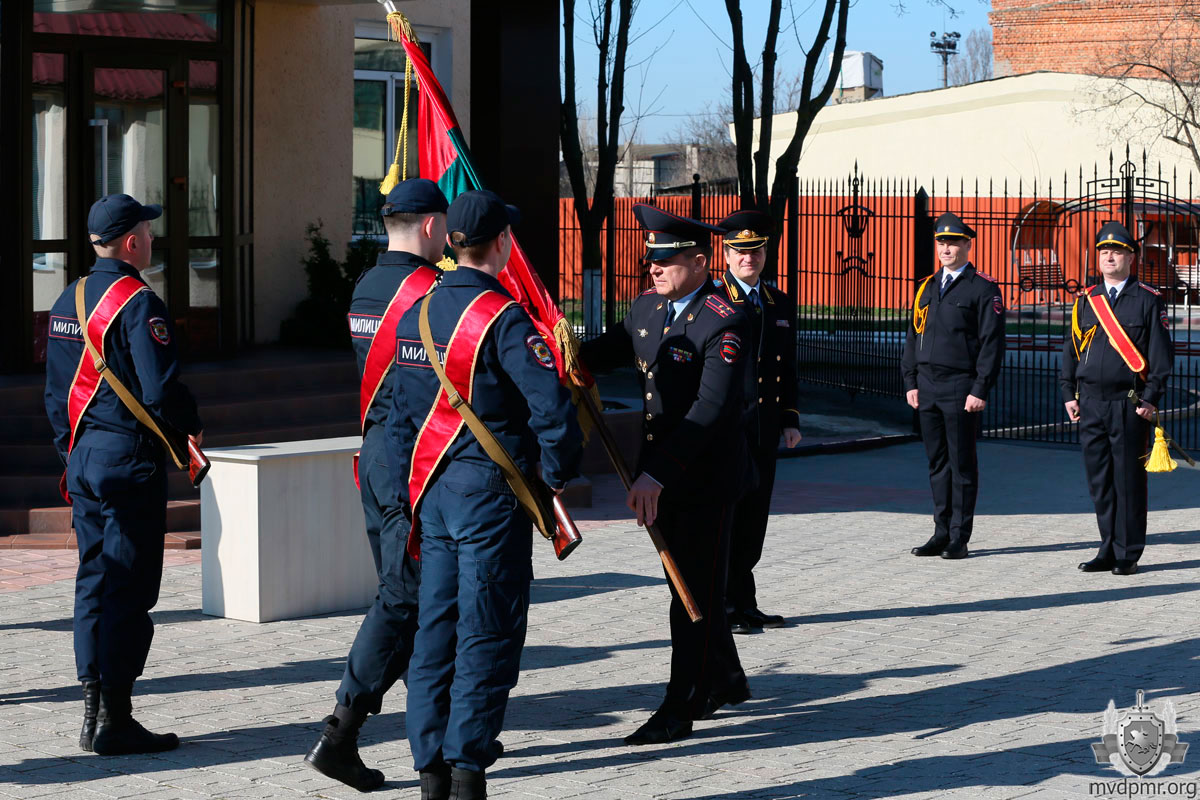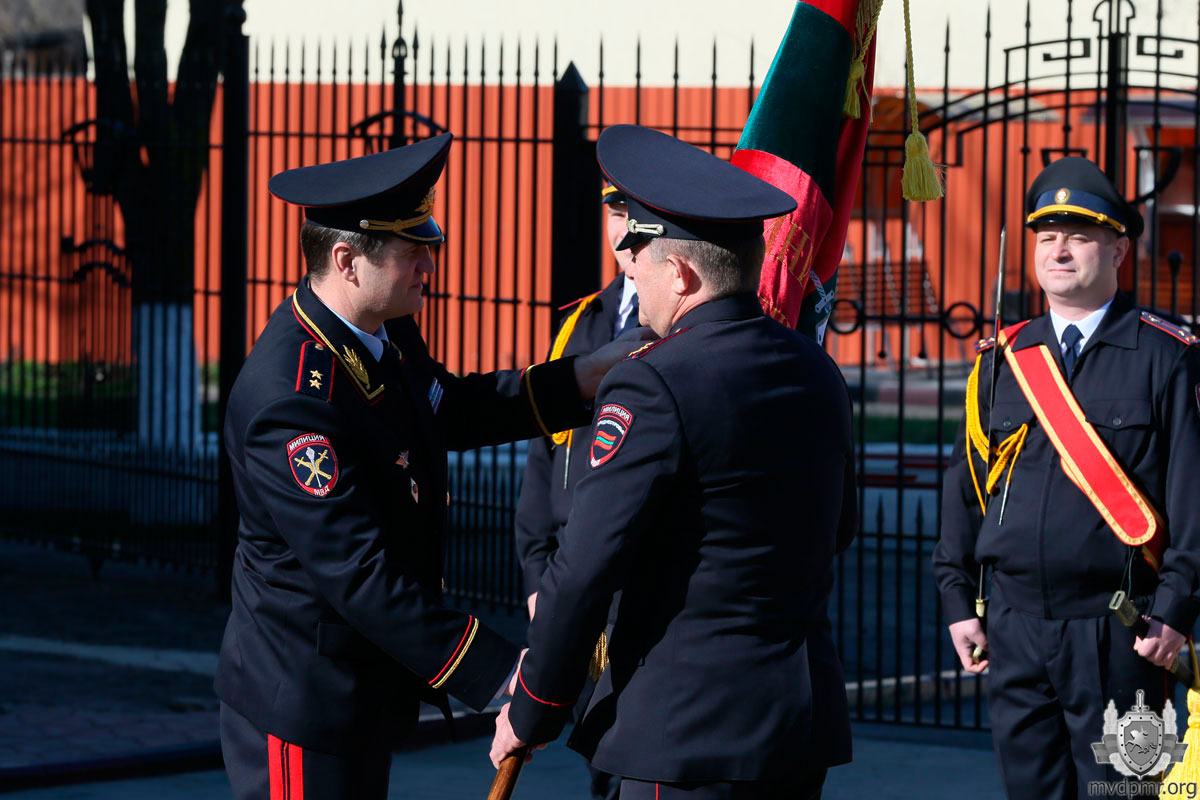 Среди территориальных подразделений МВД ПМР образцовым стало Управление внутренних дел г. Тирасполь. Руслан Мова вручил переходящее знамя начальнику столичной милиции Сергею Кирману.