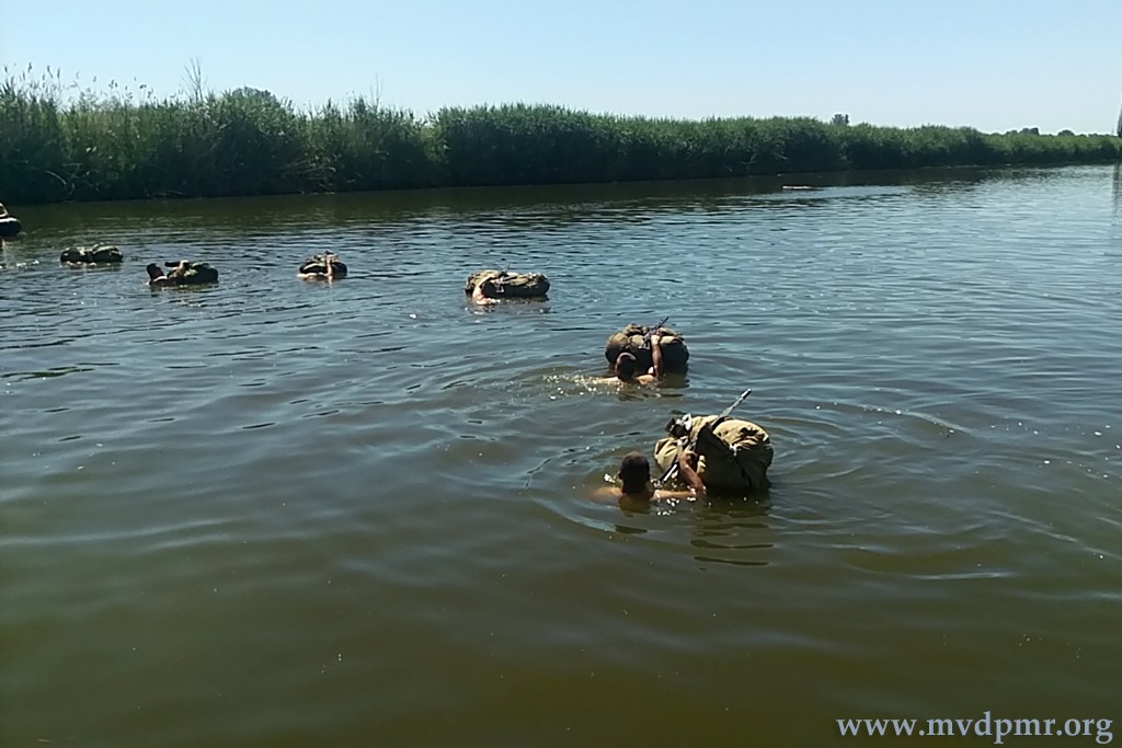 Преодоление водной преграды осуществлялось вплавь, на поплавках и по натянутому тросу. Сначала бойцы переплывали реку в специальной экипировке. Затем с помощью поплавка (вещмешок, обмундирование складывается в плащ-палатку и связывается, а сверху крепится автомат). «При плавании таким образом солдаты принимали вертикальное положение, изготавливались к стрельбе и вели огонь из автомата. Задача трудная, но бойцы справились с ней довольно легко», — отмечают в МВД.