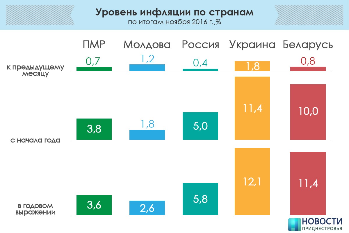 Тирасполь, 13 декабря. /ИА «Новости Приднестровья»/. По итогам ноября инфляция сложилась на уровне 0,7%. С начала года цены на товары и услуги выросли в среднем на 3,8%. Такие данные приводят специалисты Приднестровского республиканского банка в опубликованном пресс-релизе.