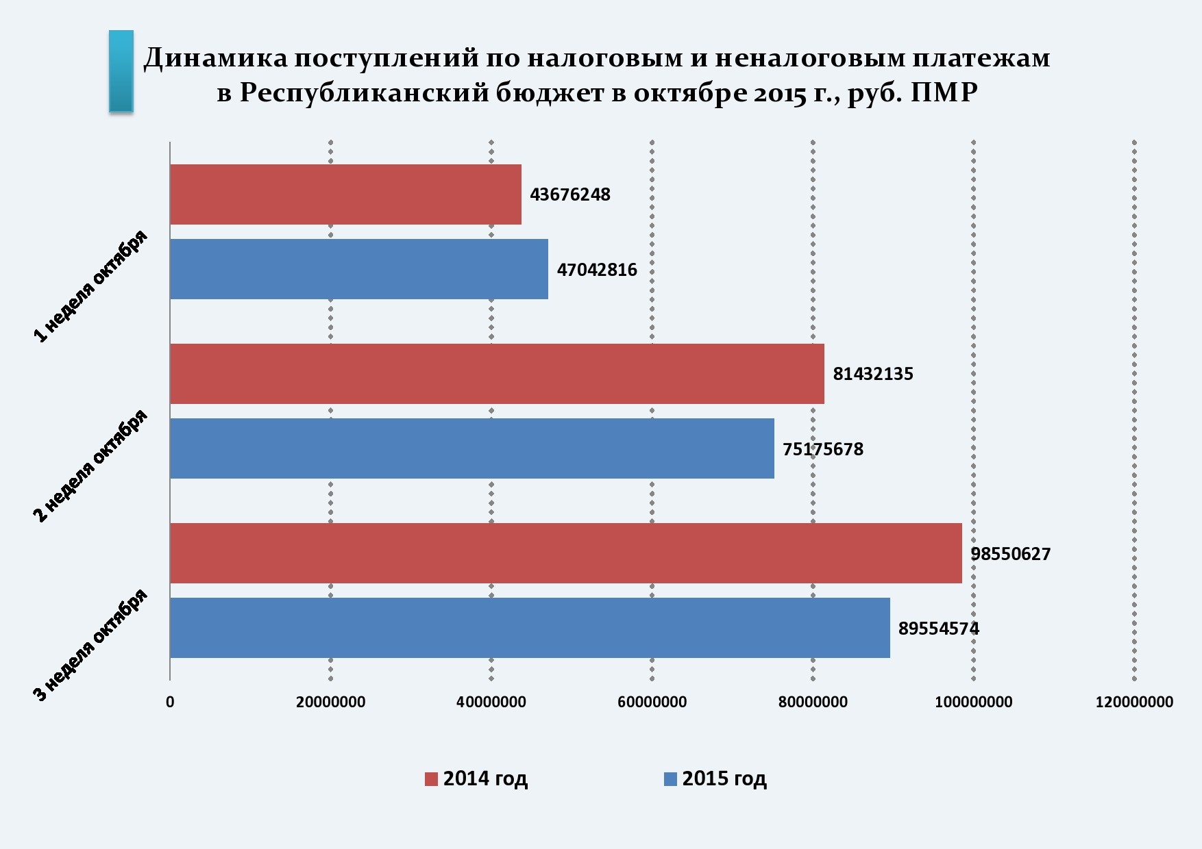 29 Окт.., 2015, 17:17Поступления в республиканский бюджет Приднестровья за три недели октября нынешнего года составили 57,2 миллиона рублей. По сравнению с таким же периодом 2014 года они упали на 38 миллионов или на 40%.