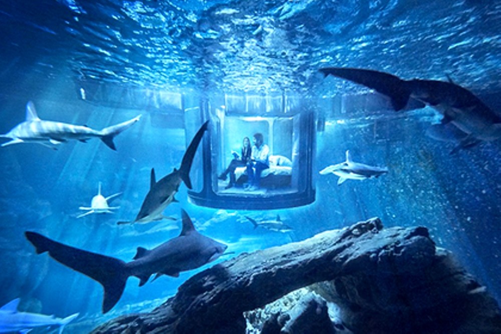 Океанариум Парижа придумал новое развлечение для посетителей — им предлагают переночевать в уютной постели в окружении акул. Прозрачный аквариум, в котором обустроена спальня, погружается на десятиметровую глубину в резервуар с 35 хищниками.