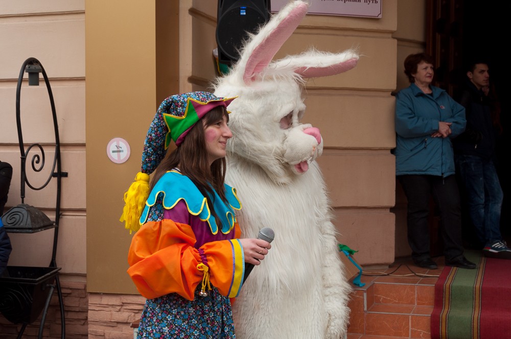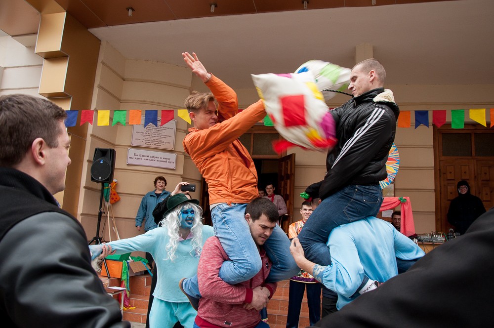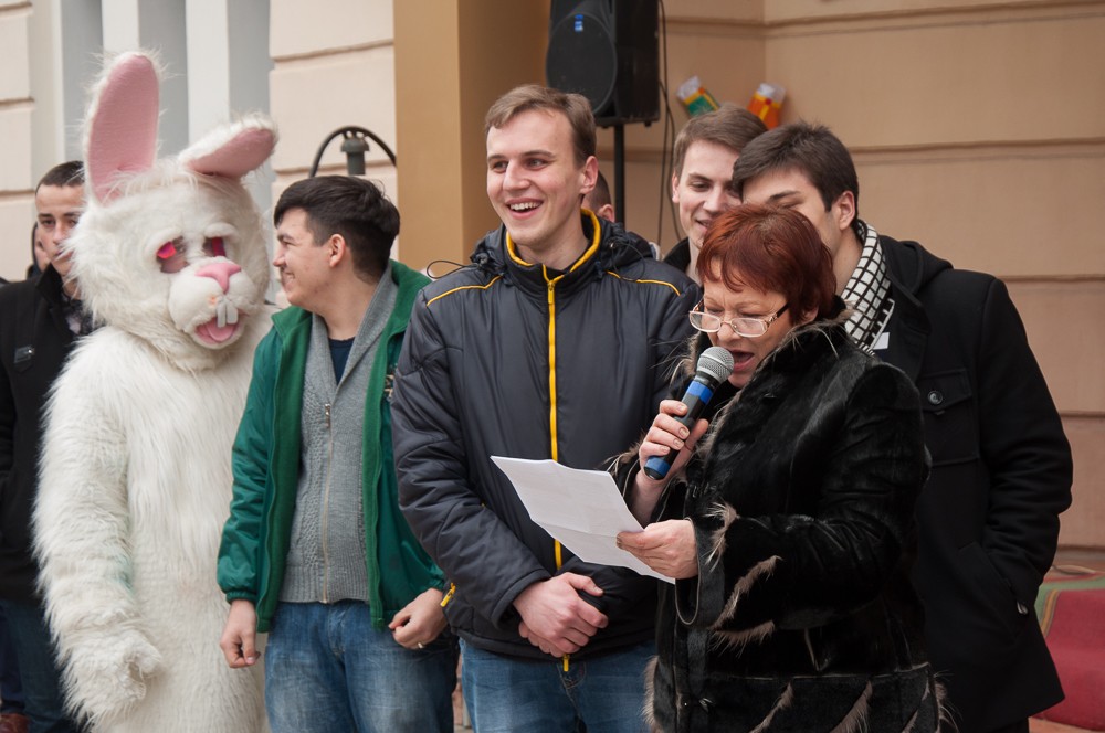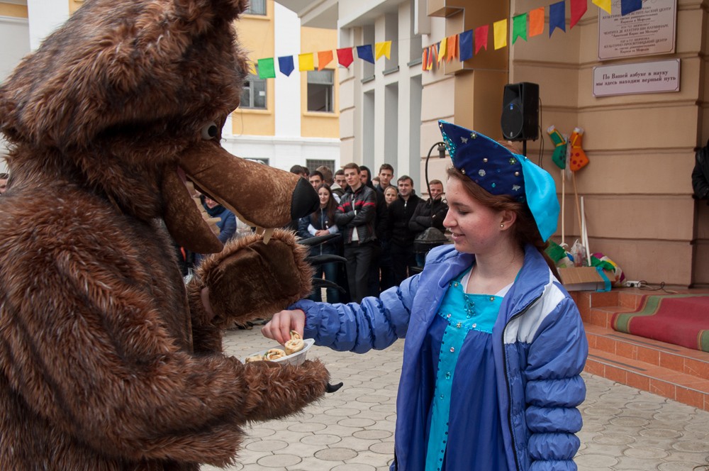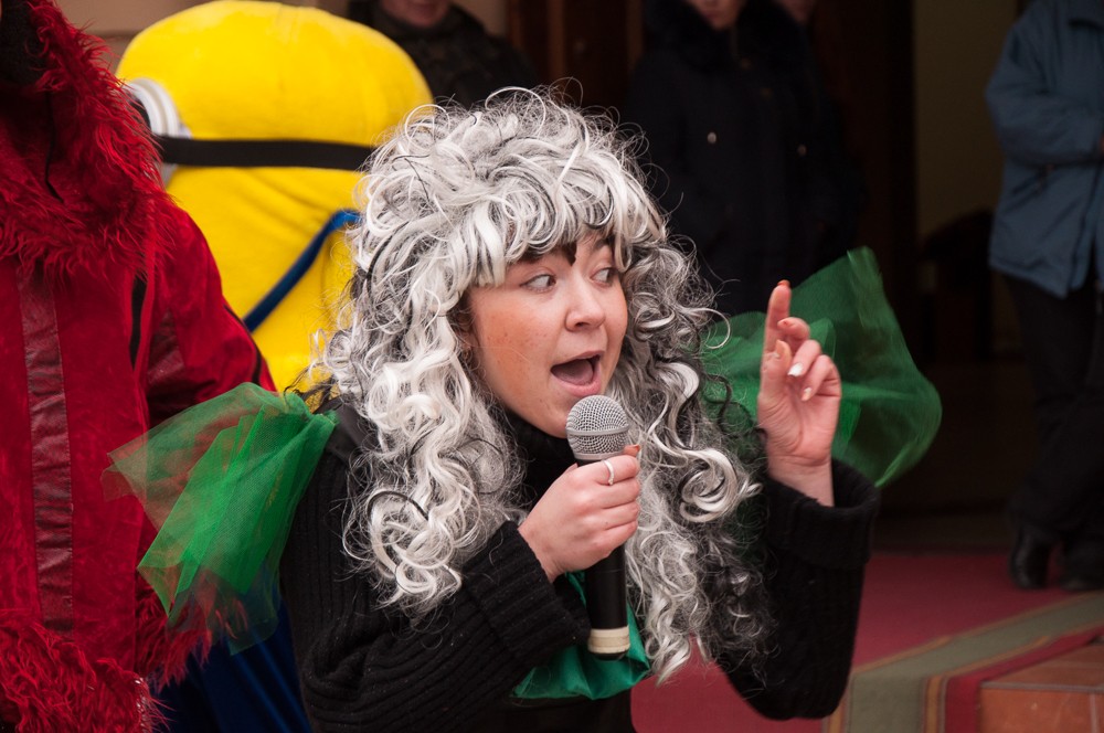 «У нас сегодня настоящий праздничный переполох – все сказочные герои сошли с ума и перемешались. Главный герой – жёлтый миньон, наш сказочный блин, а ещё есть Кикимора, Змей Горыныч, Волк и Тигруня», – рассказала студентка Елена Коваль, перевоплотившаяся на время в образ Бабы Яги.