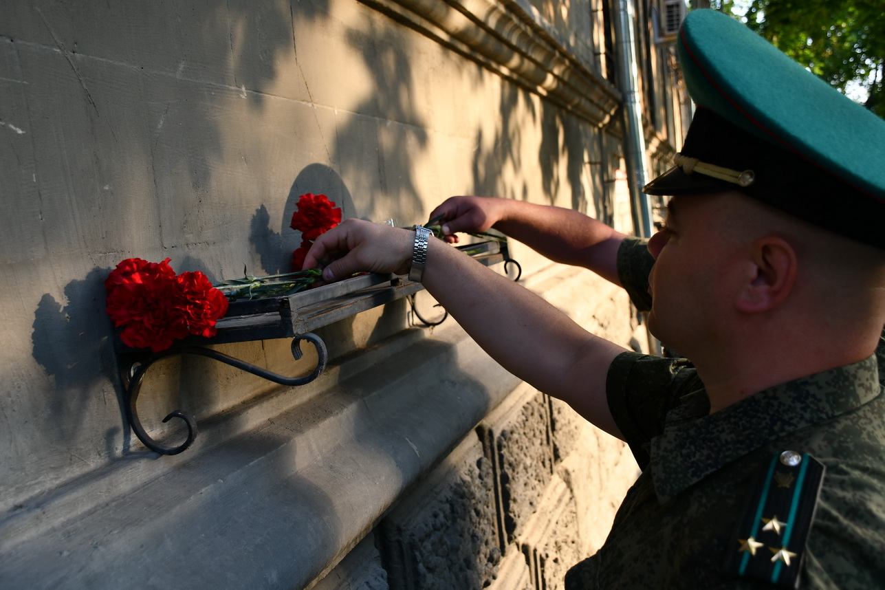 К мемориальной доске у здания штаба 25-го погранотряда, дислоцировавшегося до 1940 года в Тирасполе, возложили цветы