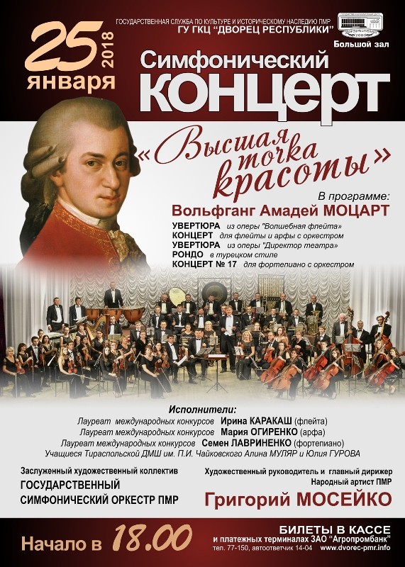 Тирасполь, 10 января. /Новости Приднестровья/. 25 января, в преддверие дня рождения великого композитора и музыканта Иоганна Амадея Моцарта (австриец родился 27 января 1756 года), Приднестровский государственный симфонический оркестр выступит с большим концертом. Мероприятие состоится во Дворце Республики.