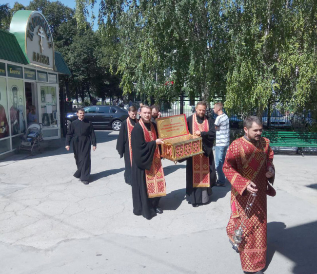 Ответственный за пребывание святыни на территории епархии, первый помощник Правящего Архиерея архимандрит Иоанн доставил святыню к вратам храма, где ее встречали настоятель собора протоиерей Иоанн Калмык и священнослужители.