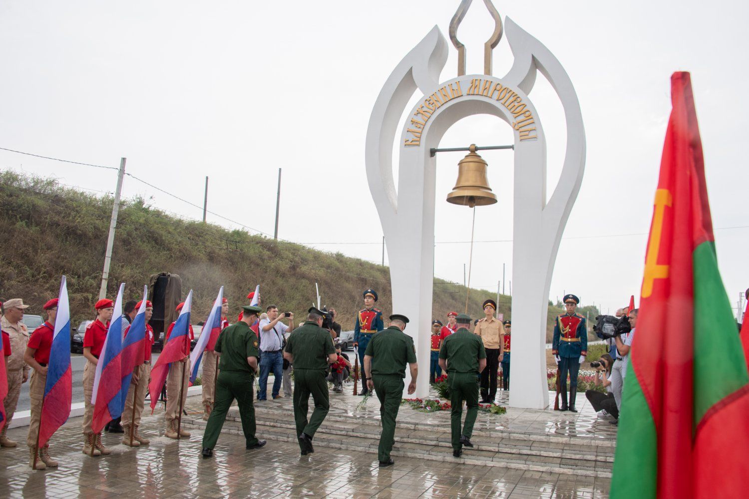Сегодня у парканской арки, выполненной в виде крыльев ангела, оберегающего приднестровскую землю, многолюдно. Руководство страны, городов и районов республики, органов государственной власти и управления, зарубежные гости, члены ОКК, военнослужащие, суворовцы, юнармейцы, представители общественных организаций и духовенства оставили цветы под колоколом, расположенным внутри арки в качестве православного оберега. Его звон напомнил о том, что миротворцы стоят на страже спокойствия и безопасности жителей Приднестровья. От имени всего приднестровского народа корзину к основанию памятника возложил Президент ПМР Вадим Красносельский.