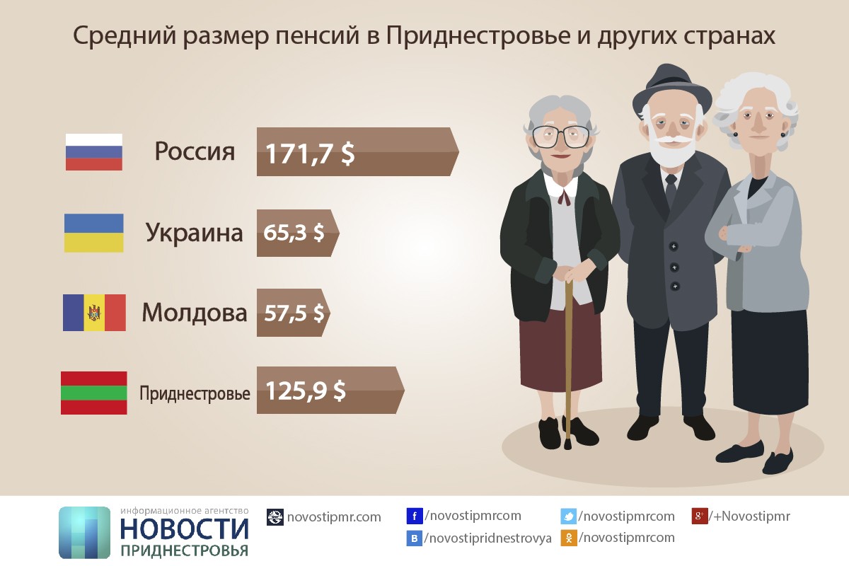 Тирасполь, 2 июня. /ИА «Новости Приднестровья»/. Средний размер пенсии в Приднестровье выше, чем на Украине и в Молдове. Об этом свидетельствуют данные, опубликованные в субботнем номере газеты «Приднестровье». Так в пересчете на доллары США средний размер пенсии в ПМР составляет $125,9, а в Молдове он примерно в два раза меньше ($57,5). На Украине средняя пенсия равняется $65,3, что составляет 51% от среднего размера пенсии в ПМР. В России средний размер пенсии выше, чем в Приднестровье на 36% и составляет $171,7.