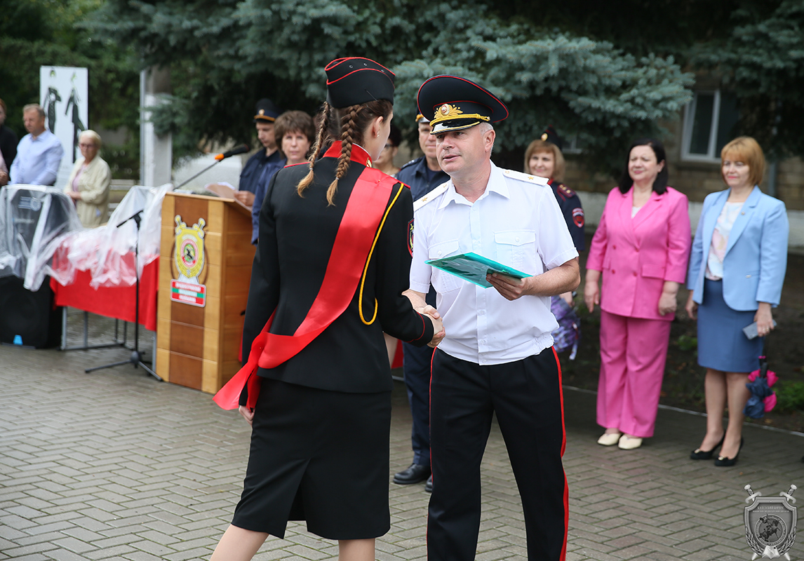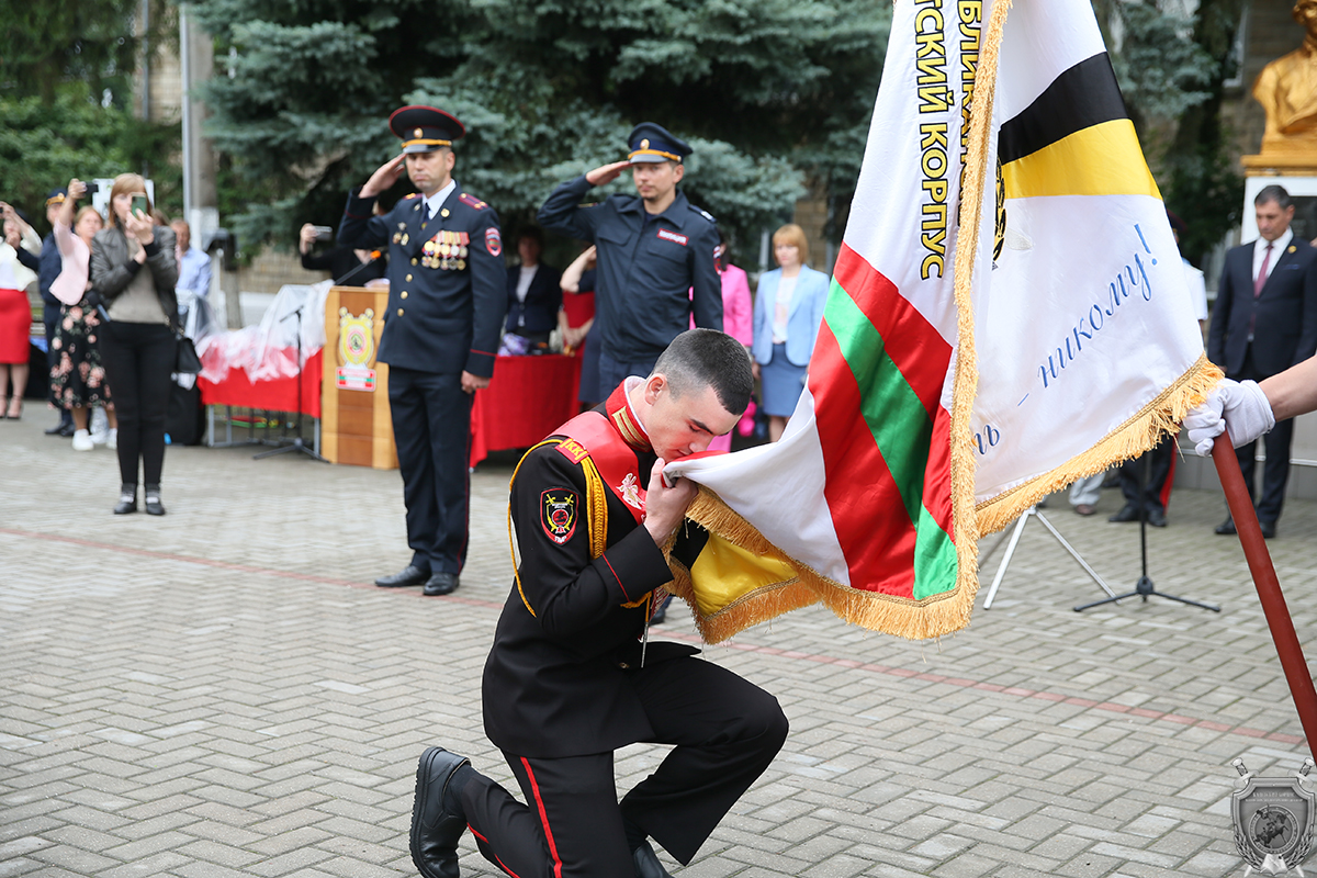 Сегодня прошла торжественная церемония вручения аттестатов и прощания со знаменем учебного заведения. На мероприятие прибыли министры внутренних дел и просвещения, первый Президент ПМР, начальники бендерской милиции и Тираспольского юридического института, глава администрации города и представитель духовенства. Собрались родные и близкие кадет, которые с волнением наблюдали за происходившим на плацу.