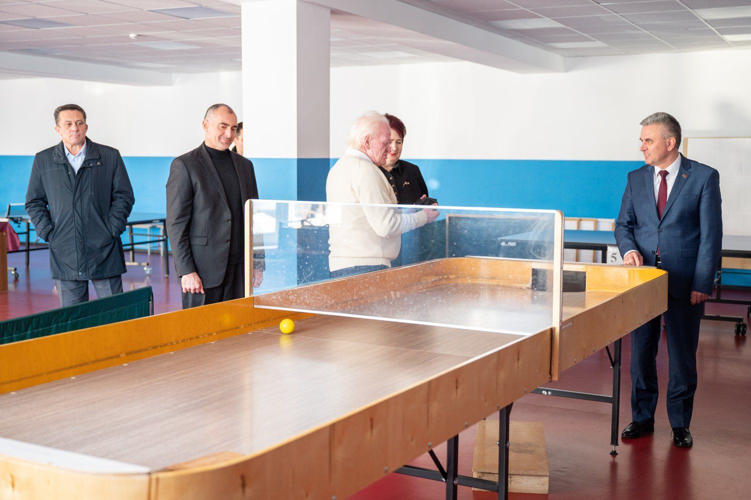 Главе государства показали недавно приобретённый шоудаун – это альтернатива настольному теннису для незрячих. Стол привезли из Дании.
