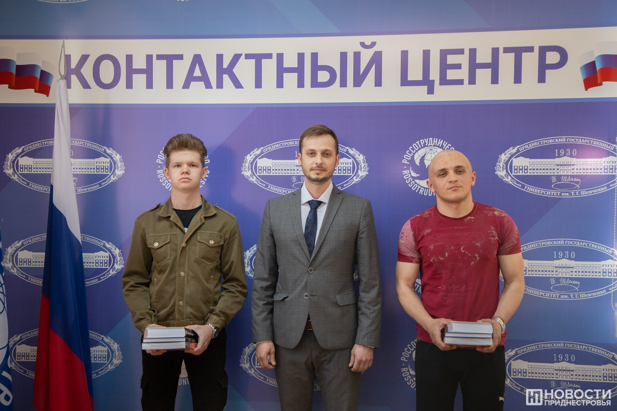 Тирасполь, 10 мая. /Новости Приднестровья/. В контактном центре Россотрудничества при ПГУ наградили победителей «Диктанта Победы». Координатор проектов по взаимодействию с Россотрудничеством Артём Науменков вручил студентам Александру Ганзий и Яну Рылову комплекты книг по истории России.