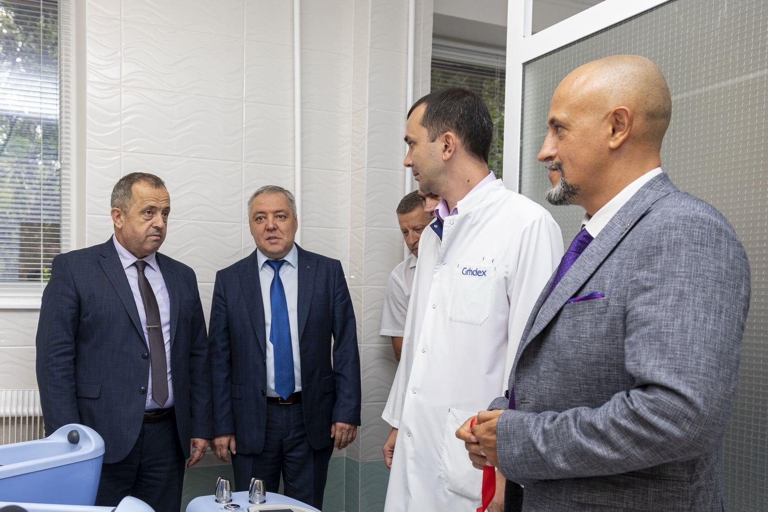 Александр Розенберг и Сергей Корнев торжественно перерезали красную ленточку, а затем отправились ближе знакомиться с работой обновленного физиотерапевтического отделения.