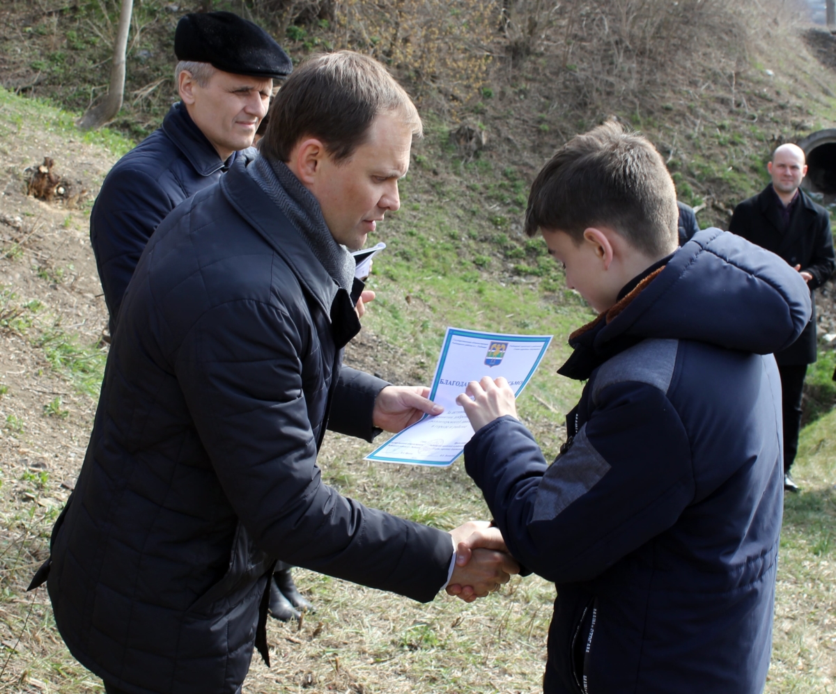 Глава госадминистрации Вячеслав Фролов и председатель горрайсовета Вадим Лозовский поблагодарили волонтёров за участие в облагораживании исторически важного объекта и вручили ребятам благодарственные письма, сообщает пресс-служба районного органа власти.
