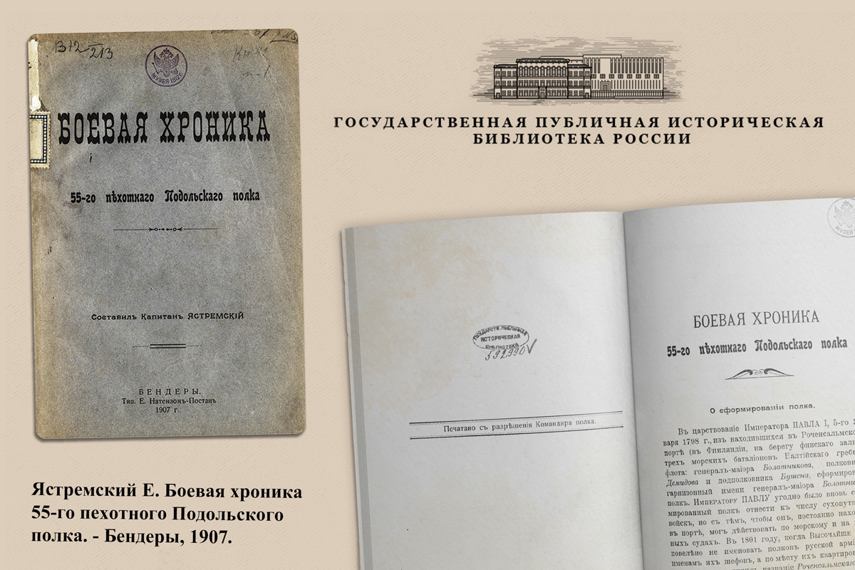 События Отечественной войны 1812 года, оборона Севастополя, зима на Шипке и сражения на сопках Манчжурии – обо всём этом рассказывается в книге капитана Ястремского «Боевая хроника 55-го пехотного Подольского полка», выложенной на официальном сайте Государственной публичной исторической библиотеки России.