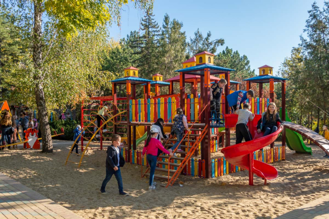 Игровая площадка включает в себя городок-лабиринт, качели для деток с ограниченными возможностями здоровья. А также аттракцион человек-паук, качели и карусели для самых маленьких и многое другое.