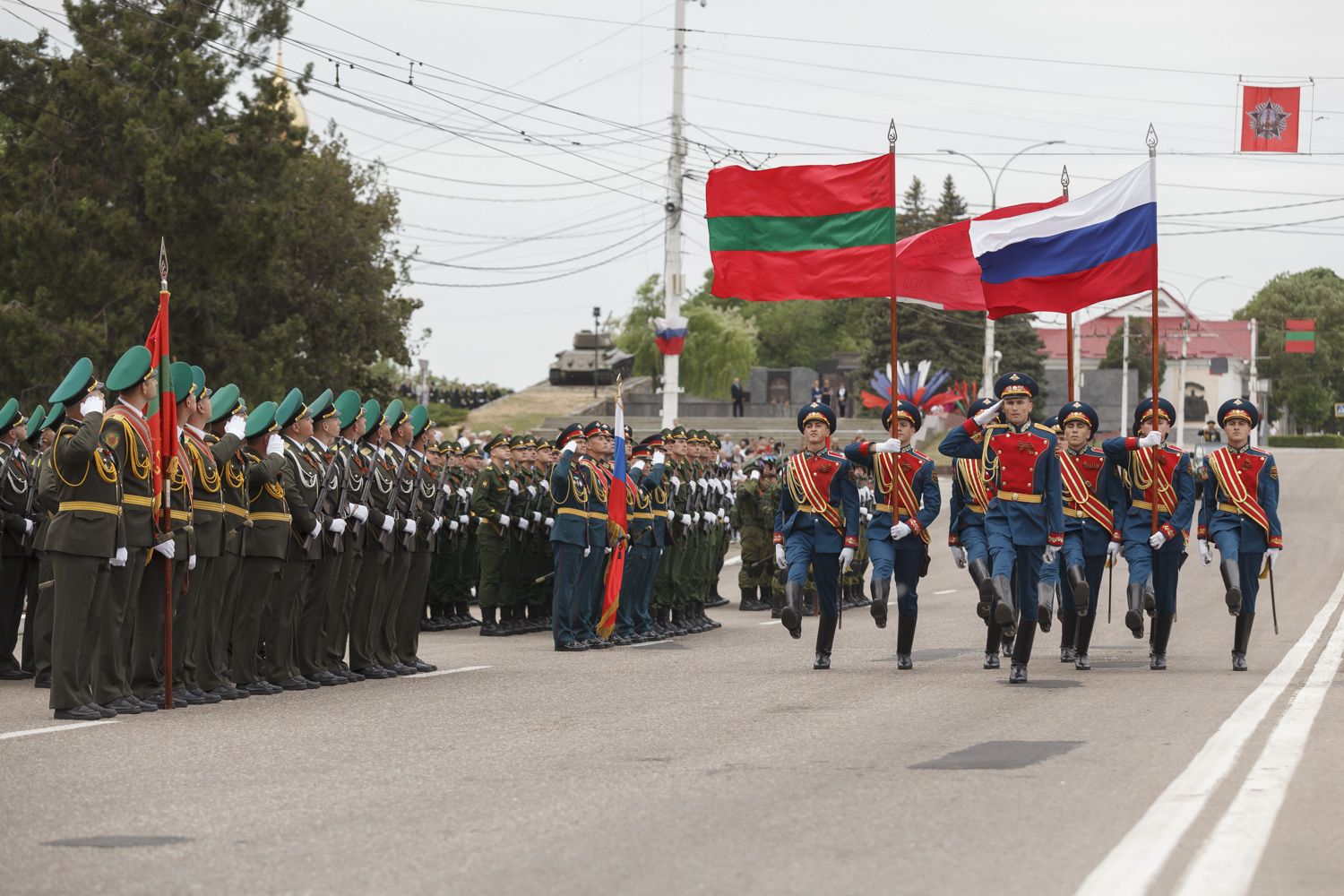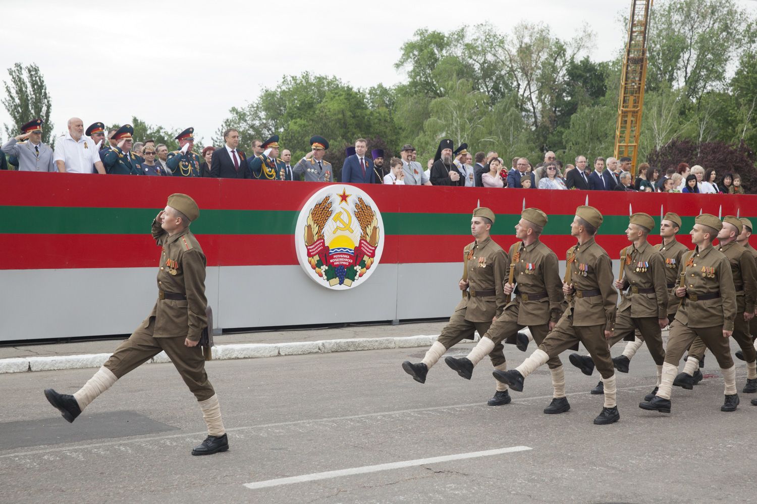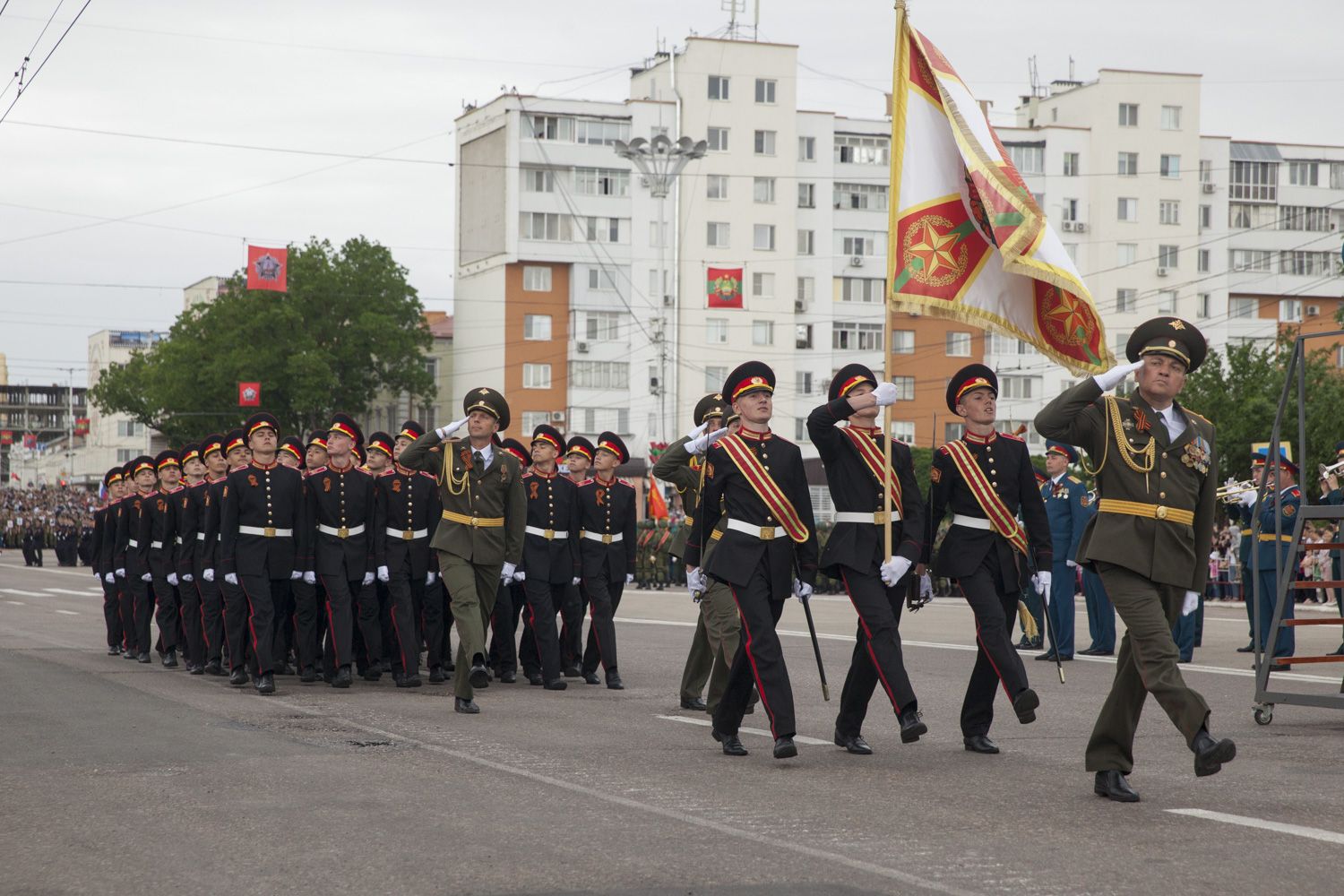 Далее парадным маршем перед гостями праздника пройдут десять парадных расчетов, в том числе курсанты Военного института в форме времен Великой Отечественной войны и штандартами всех фронтов. Впервые в нём примут участие воспитанники Тираспольского Суворовского военного училища.