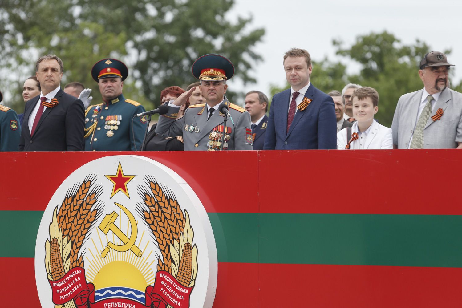 Ранее тираспольчане и гости города приняли участие в церемонии поднятия флага ПМР и Знамени Победы.