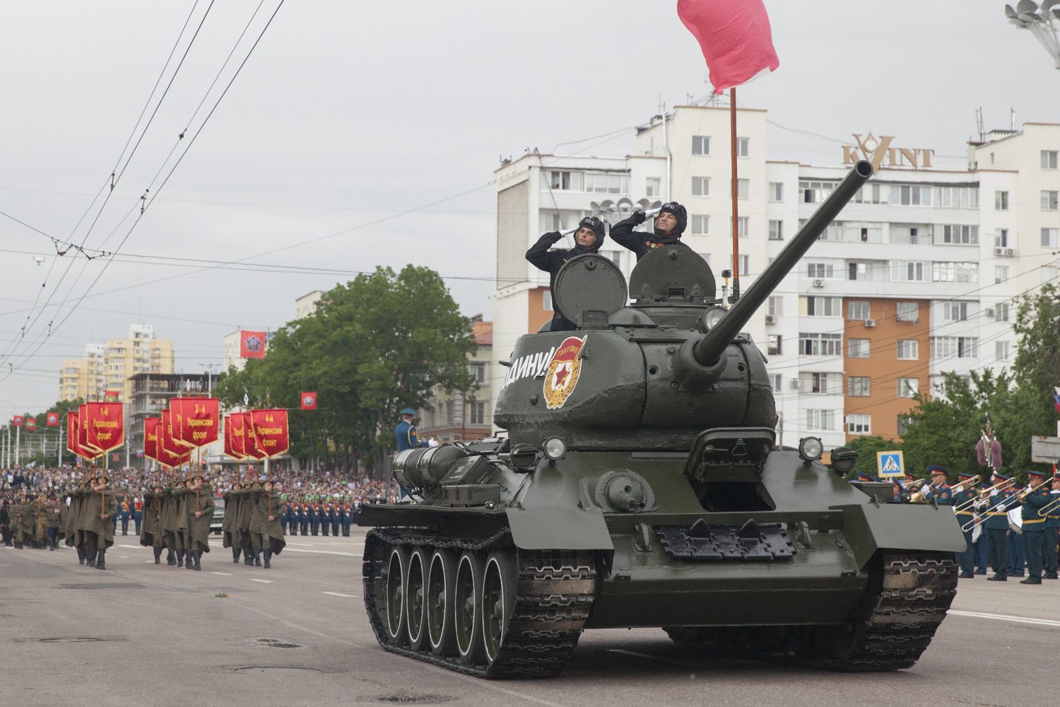 Тирасполь, 9 мая. /Новости Приднестровья/. В приднестровской столице начался военный Парад в честь 73-й годовщины Победы в Великой Отечественной войне. По главной площади Тирасполя проехал легендарный танк Т-34 с точной копией Знамени Победы.