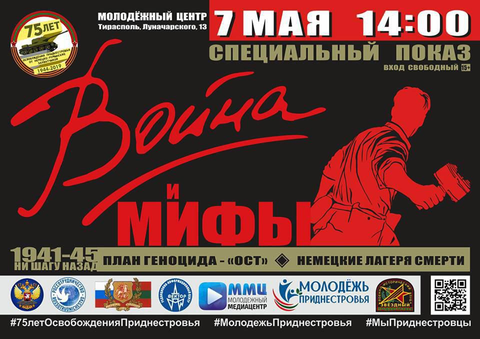 Тирасполь, 6 мая. /Новости Приднестровья/. Во вторник, 7 мая, в 14:00 в городском Молодёжном центре Тирасполя пройдёт специальный показ и обсуждение двух серий документального фильма «Война и мифы». Мероприятие приурочено ко Дню Победы и проводится в рамках празднования 75-летия освобождения Приднестровья от немецко-румынских захватчиков.