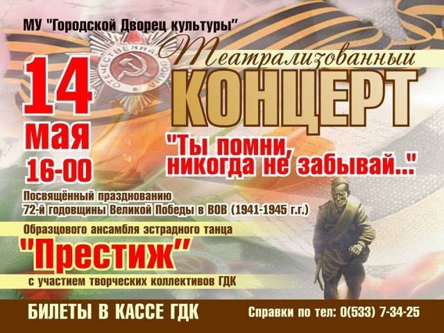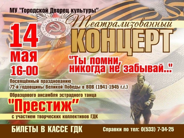Мероприятие под названием «Ты помни, никогда не забывай…» состоится 14 мая в Городском Дворце культуры