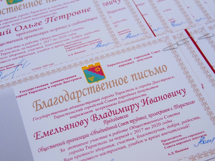 Членов предыдущего состава организации поблагодарили, а также наградили благодарственными письмами и почётными грамотами руководства столицы, вручили медали «75 лет Победы в Великой Отечественной войне» и «100 лет Тираспольскому городскому совету».