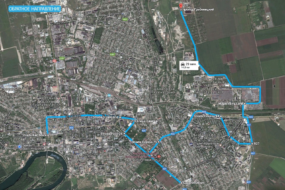 «В обратном направлении: по ул.9 Января — „Мегадом“ — пригородная автостанция (возле плавательного бассейна) — правый поворот ул. Синёва — ул. Мира — опять же доезд до ИТК-3 — разворот, скорее всего, будет возле въезда в Суклею (памятник „колхозникам“) — далее по ул. Мира в сторону Одесской — потом по объездной — ул. Комсомольская (практически до канала), проходя мимо поликлиники, мимо СШ № 5 — далее по ул. Тираспольской (район ЗАО „Тиротекс“ — ИТК-2», — рассказал начальник Управления торговли и транспорта госадминистрации Роман Кулиш.