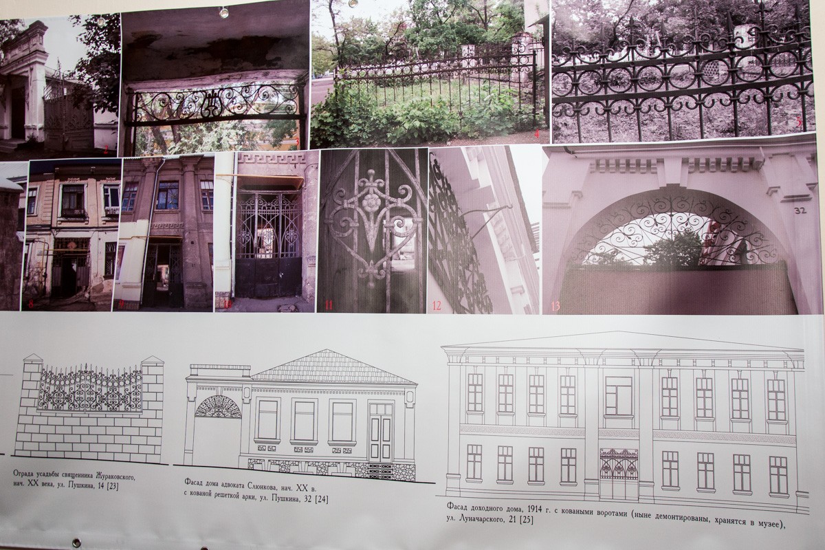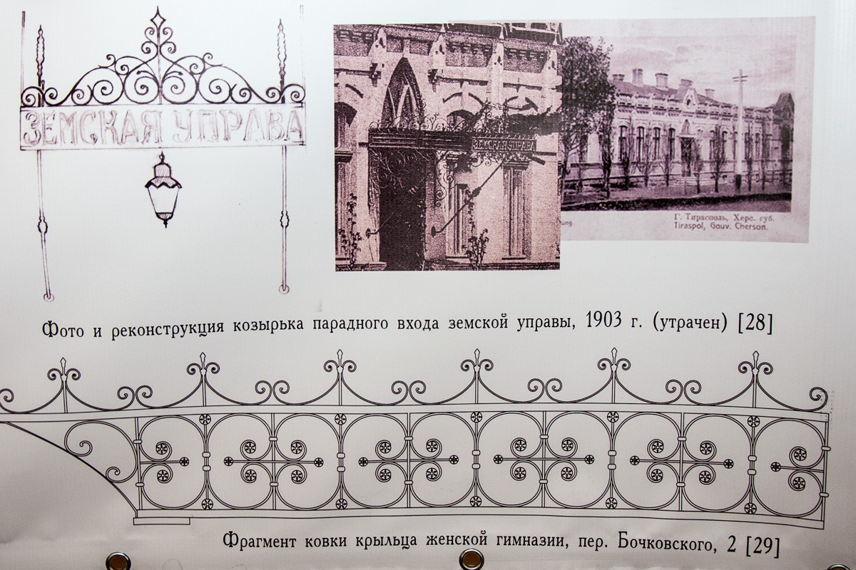 Отдельный акцент — на «архитектурном металле» Тирасполя. В этом разделе крупный план — на фрамугах дверей, кованых козырьках, калитках, ограждениях парапетов кровли и иных элементах со стальными и чугунными завитушками. Всего 100 лет назад иметь их на своём доме было модно и престижно, такие украшения заказывали лучшим кузнецам, сегодня большая часть из них покрывается ржавчиной.