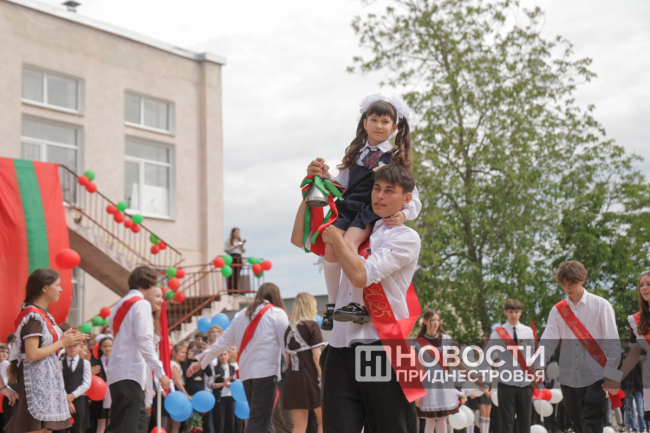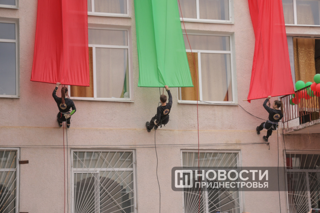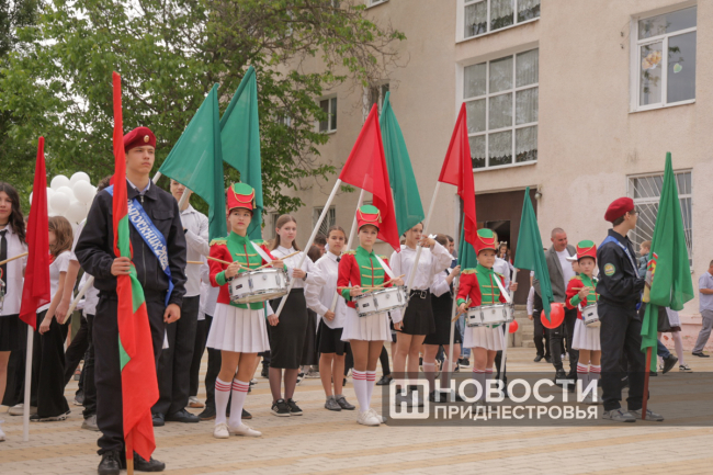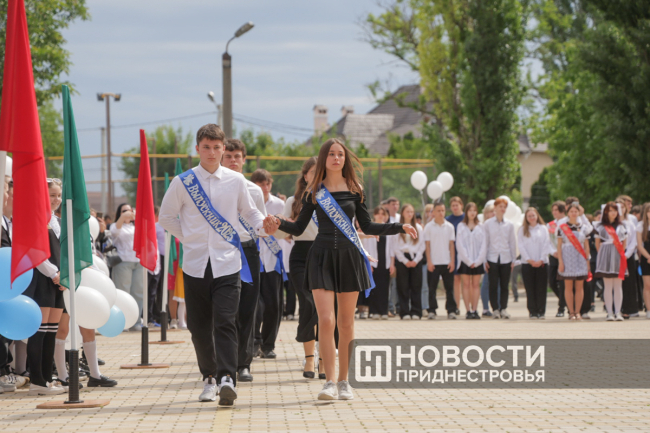 Программа Последнего звонка там, как всегда, насыщенная. Флаг Приднестровья на здании школы развернули скалолазы, праздничное выступление подготовили барабанщицы. Выпускники передали символический Огонь знаний ученикам родной школы.
