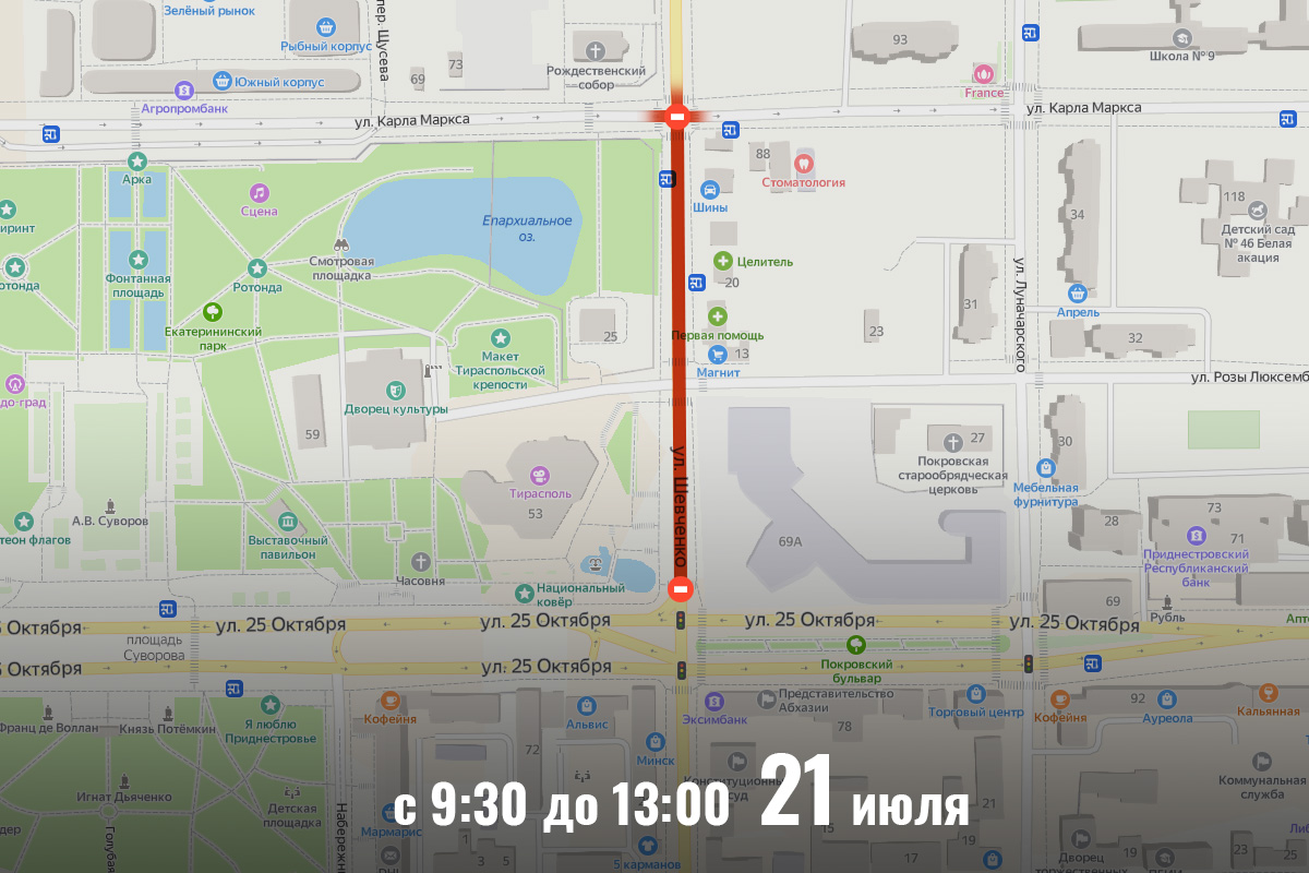 Тирасполь, 19 июля. /Новости Приднестровья/. Филиал ООО «Тираспольтрансгаз-Приднестровье» в столице информирует: в Тирасполе 21 июля с 9:30 до 13:00 будет приостановлено движение автотранспорта на перекрёстке улиц Шевченко и К. Маркса, а также на участке по улице Шевченко – от ул. К. Маркса до ул. 25 Октября.