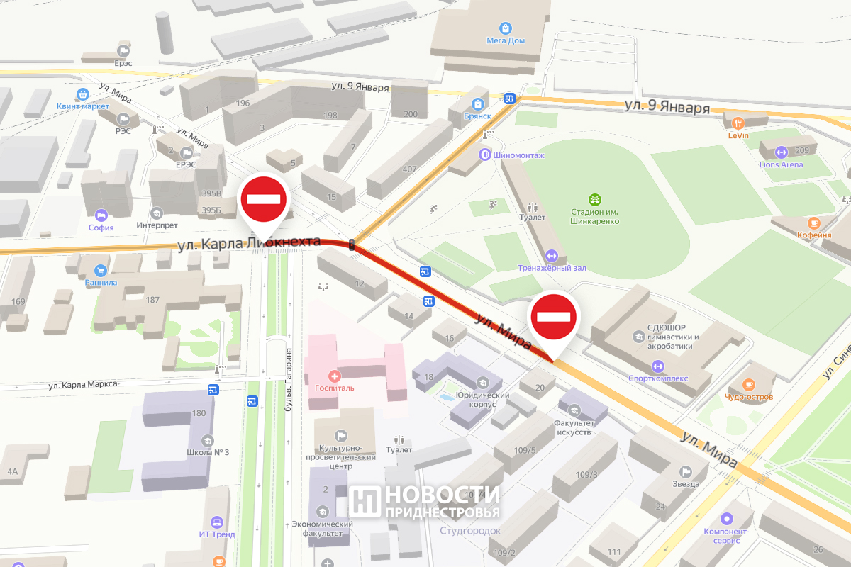 Тирасполь, 21 апреля. /Новости Приднестровья/. С 25 по 26 апреля в Тирасполе полностью перекроют движение автотранспорта по улице Карла Либкнехта в районе бульвара Гагарина. Также движение будет ограничено по улице Мира на участке от улицы Карла Либкнехта до дома № 20 по улице Мира.
