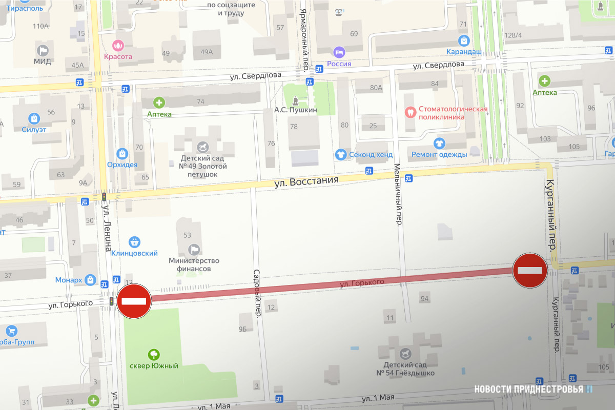 Тирасполь, 4 августа. /Новости Приднестровья/. В Тирасполе по ул. Горького на участке от пер. Курганного до ул. Ленина временно перекрыто движение автотранспорта. Это связано с выполнением земляных работ по реконструкции сети канализации, которая продлится до 30 августа.