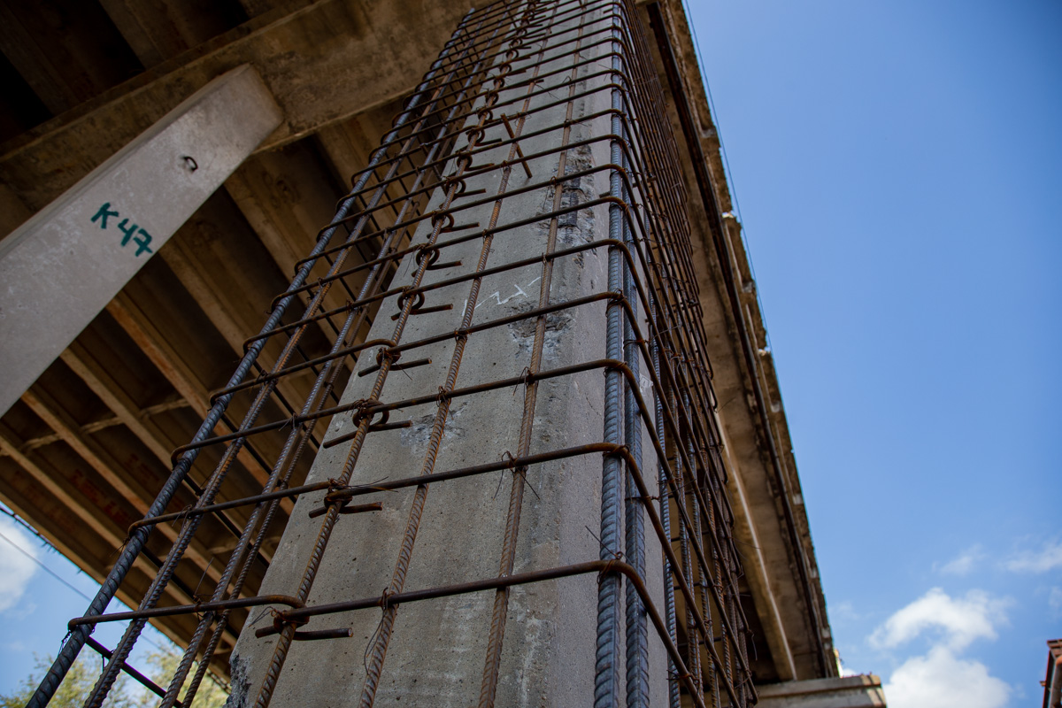 «Первый этап – укрепление 85 колонн. Каждую из них нужно взять в железобетонную обойму: сначала устанавливается металлическая конструкция (из арматуры нескольких видов), потом делаем опалубку и заливаем бетоном. Думаю, что работы по усилению колонн мы закончим до конца года. На следующий год запланирован ремонт железобетонных ригелей, опорных подушек, тротуаров, которые проходят справа и слева, опорных стен», – пояснил Александр Сухань.