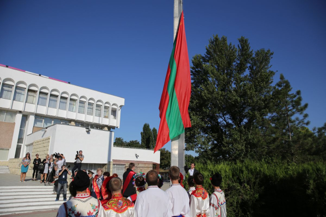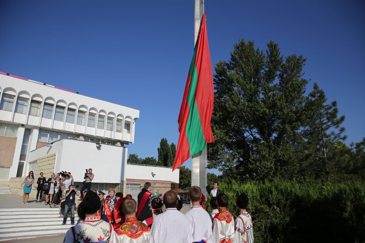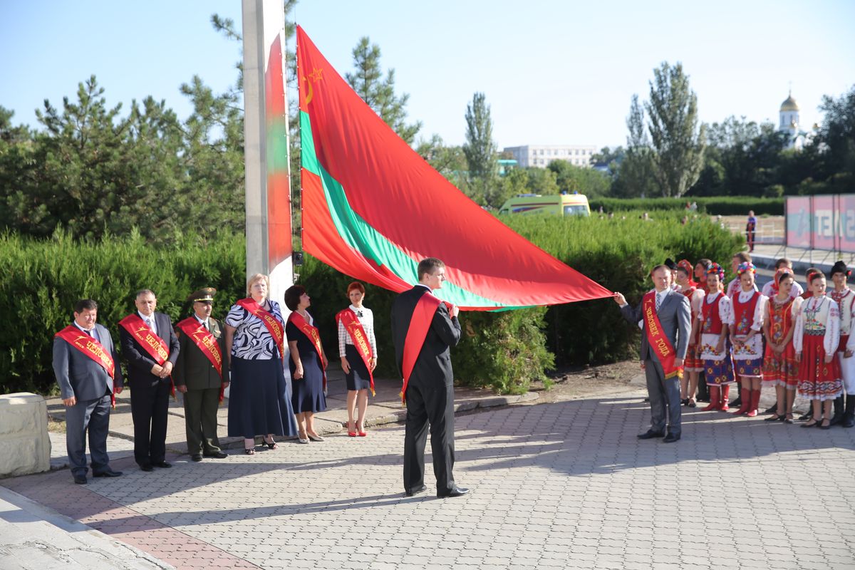 Далее колонны участников митинга двинулись ко Дворцу детско-юношеского творчества, где прошла церемония поднятия Государственного флага Приднестровской Молдавской Республики. Из года в год почетное право поднять флаг предоставляют лауреатам Республиканского конкурса «Человек года».