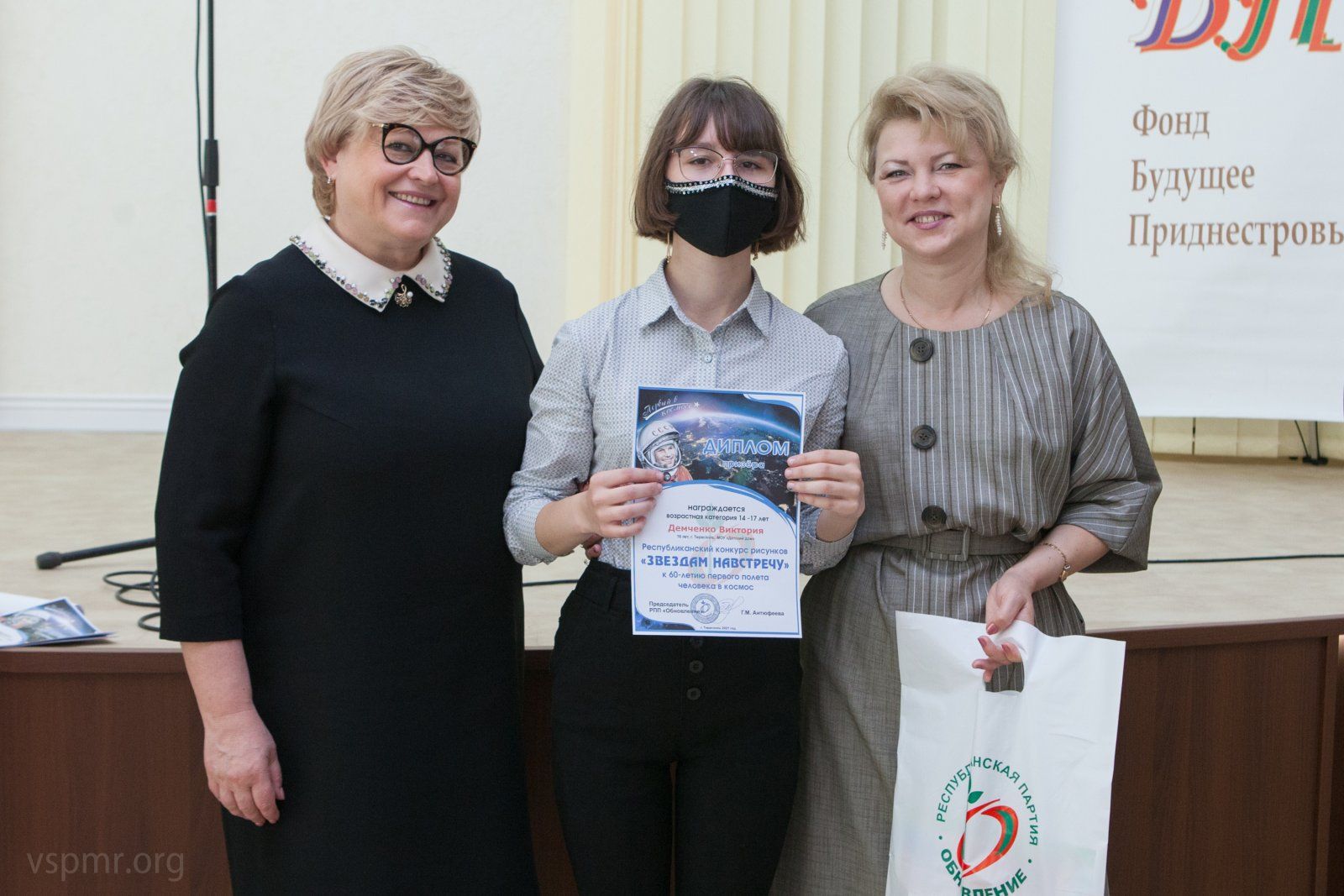 «Так важно, когда вы участвуете в таких великолепных конкурсах, которые посвящены первому полету в космос. Вы сами интересуетесь, узнаете что-то новое о достижениях в космосе, о новых технологиях. Конечно, ваши картины и рисунки поразили всех. Члены жюри никак не могли определиться, кому же отдать первенство. Участвовали даже из села Рашково Каменского района, Рыбницкого района. Желаю новых творческих успехов, чтобы вы дерзали, продолжали любить искусство, творить и участвовать в проектах», – обратилась к участникам конкурса заместитель председателя Верховного Совета, руководитель республиканской партии «Обновление» Галина Антюфеева.