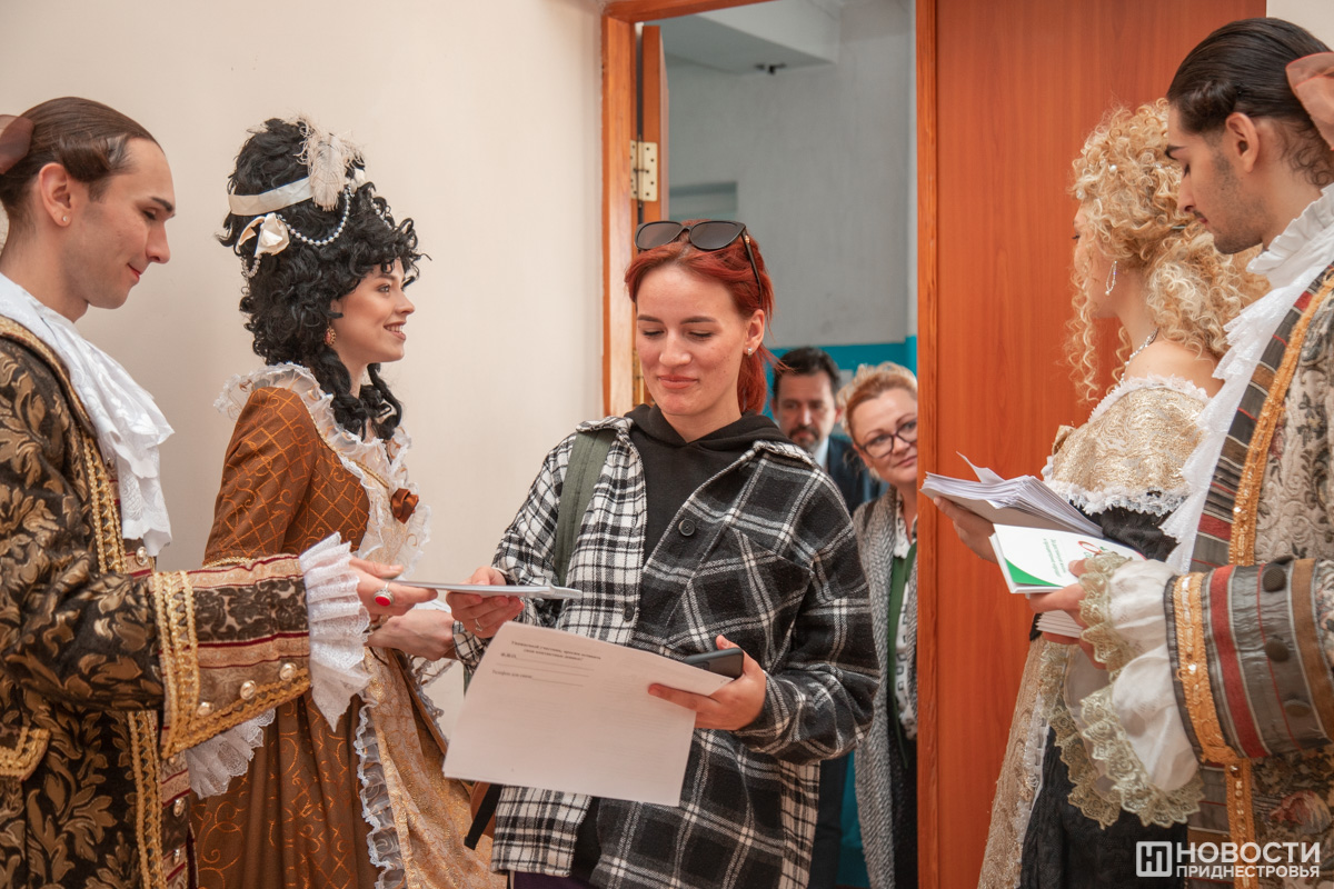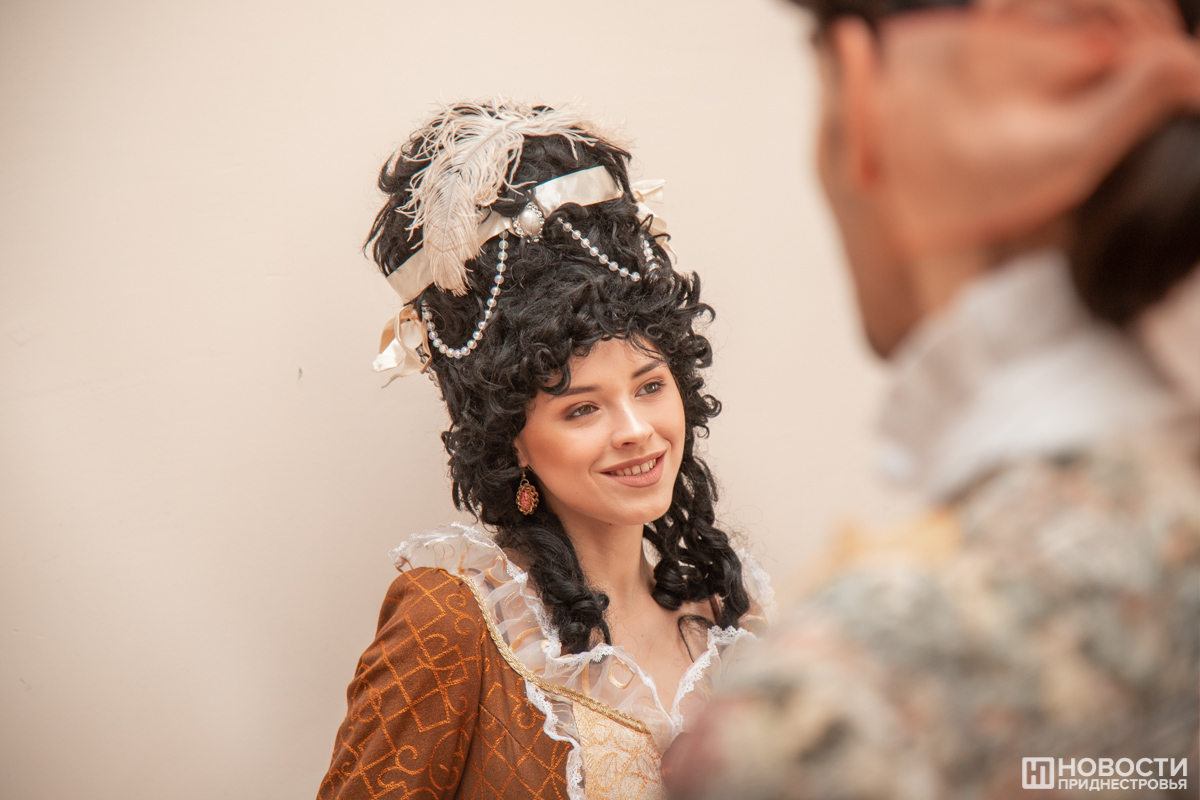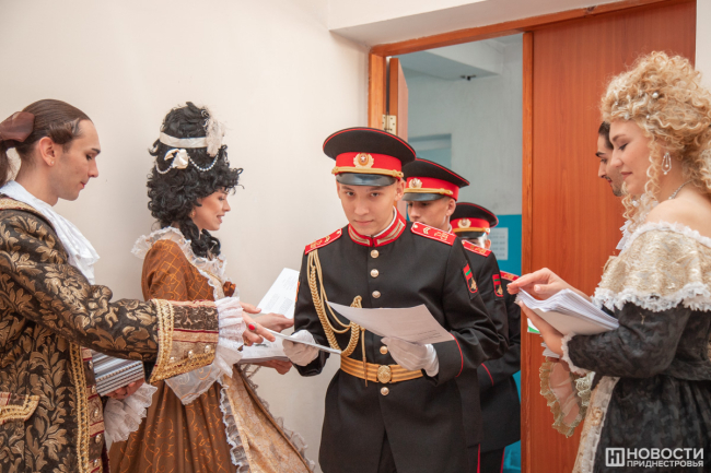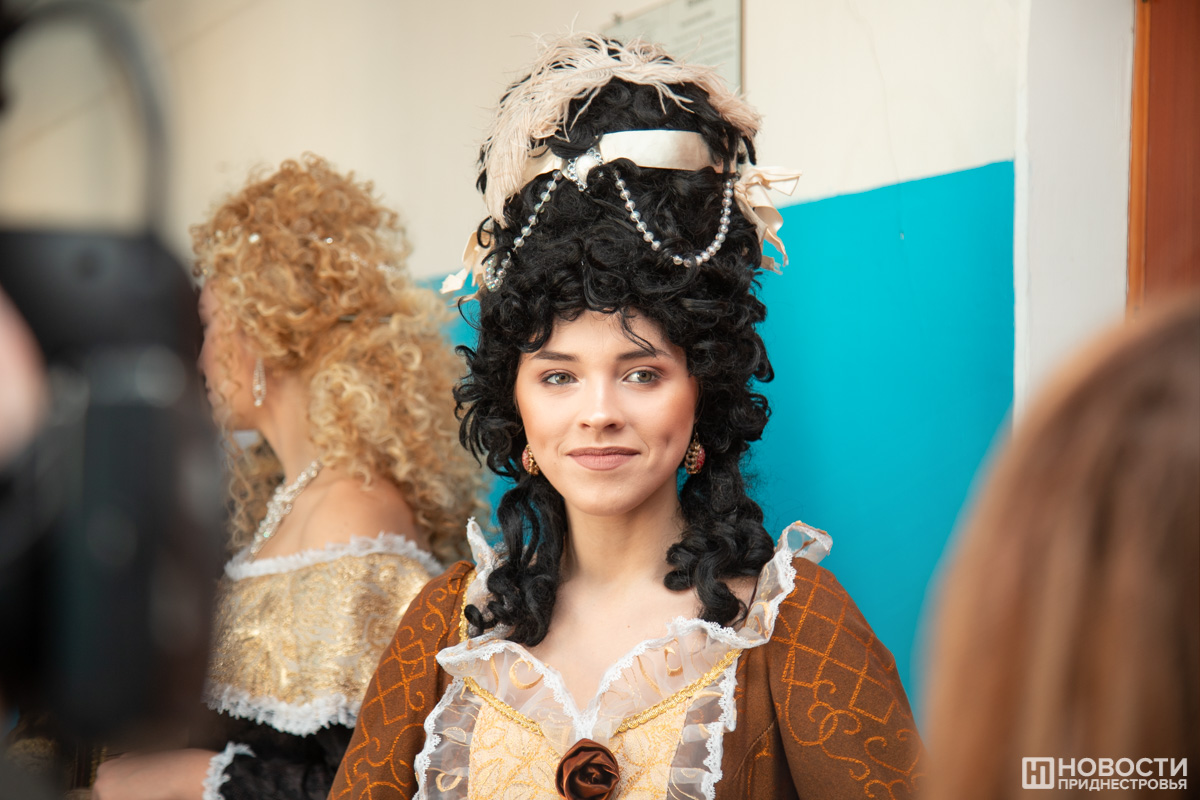Листы с заданиями раздавали исторические персонажи Екатерининской эпохи. Это артисты приднестровского государственного театра помогали создавать нужную атмосферу.