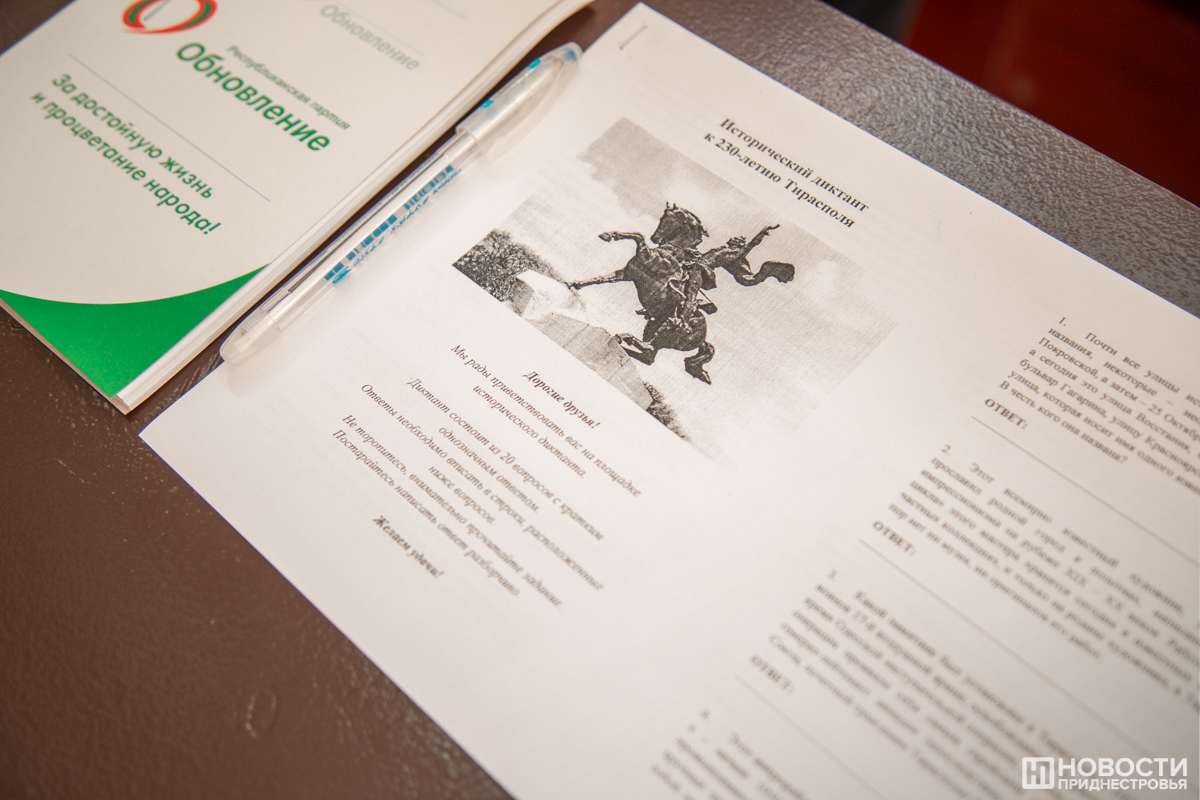 Тирасполь, 12 октября. /Новости Приднестровья/. Послезавтра Тирасполю исполнится 230 лет. В честь этой даты сегодня в Приднестровском госуниверситете писали исторический диктант. Акция открытая – принять участие мог любой желающий от школьника до декана одного из факультетов вуза. Идея провести её принадлежит партии «Обновление». Вопросы придумывали при поддержке директора Тираспольского объединённого музея Аллы Мельничук.