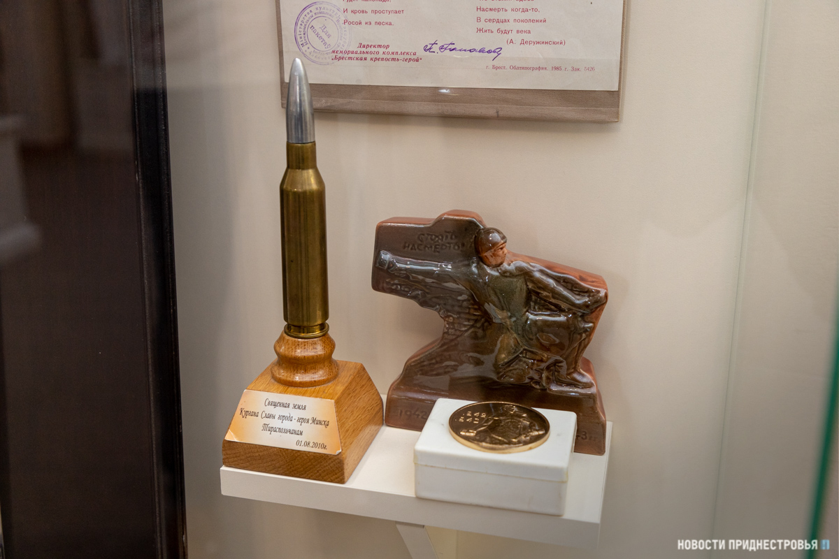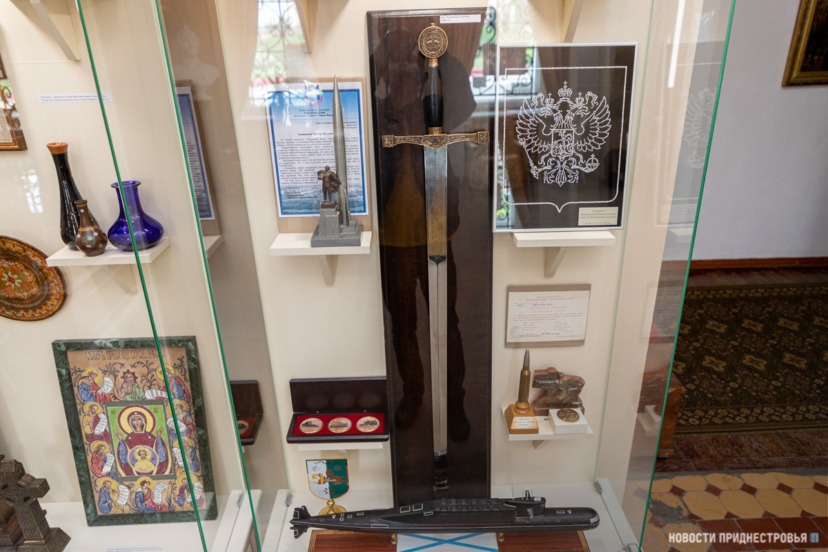 Отдельная витрина посвящена различным историческим событиям. Здесь, например, есть сувениры из Сталинграда (с частицами земли, взятой с братских могил), Бреста и Минска. Здесь же – меч, который в начале 2000-х привезла в Приднестровье абхазская делегация.