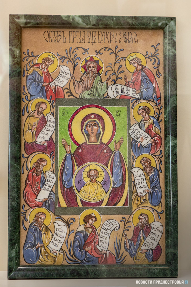 «Вот, например, икона "Образ Пресвятой Богородицы Курская-Коренная". Выполненная на мраморе, она была подарена митрополитом Курским и Рыльским Ювеналием. Рядом - макет резной стелы "Армянский крест", подарок делегации из Нагорного Карабаха. Это уникальный вид армянских архитектурных памятников и святынь, представляющих собой в оригинале каменную стелу с резным изображением креста – хачкар. В 2010 году искусство и символизм хачкара были включены в список культурного наследия ЮНЕСКО. Это особые подарки, несущие пожелания процветания, благополучия и защиты от бед», – пояснила музейный работник.