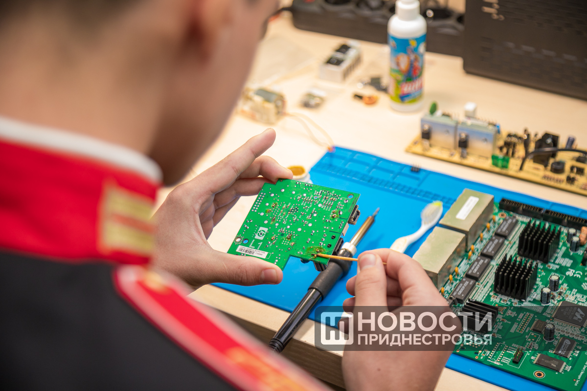 «Это материнская плата. Если нам нужно заменить какую-то неисправную деталь, мы сначала её мажем флюс-пастой, а потом начинаем отпаивать и двигать, она будет потихоньку отходить. Для меня это уже второе занятие, интересно тем, что можно выбрать разные направления и по очереди ими заниматься. Я вот ещё пробовал роботов собирать», – поделился впечатлениями один из ребят.